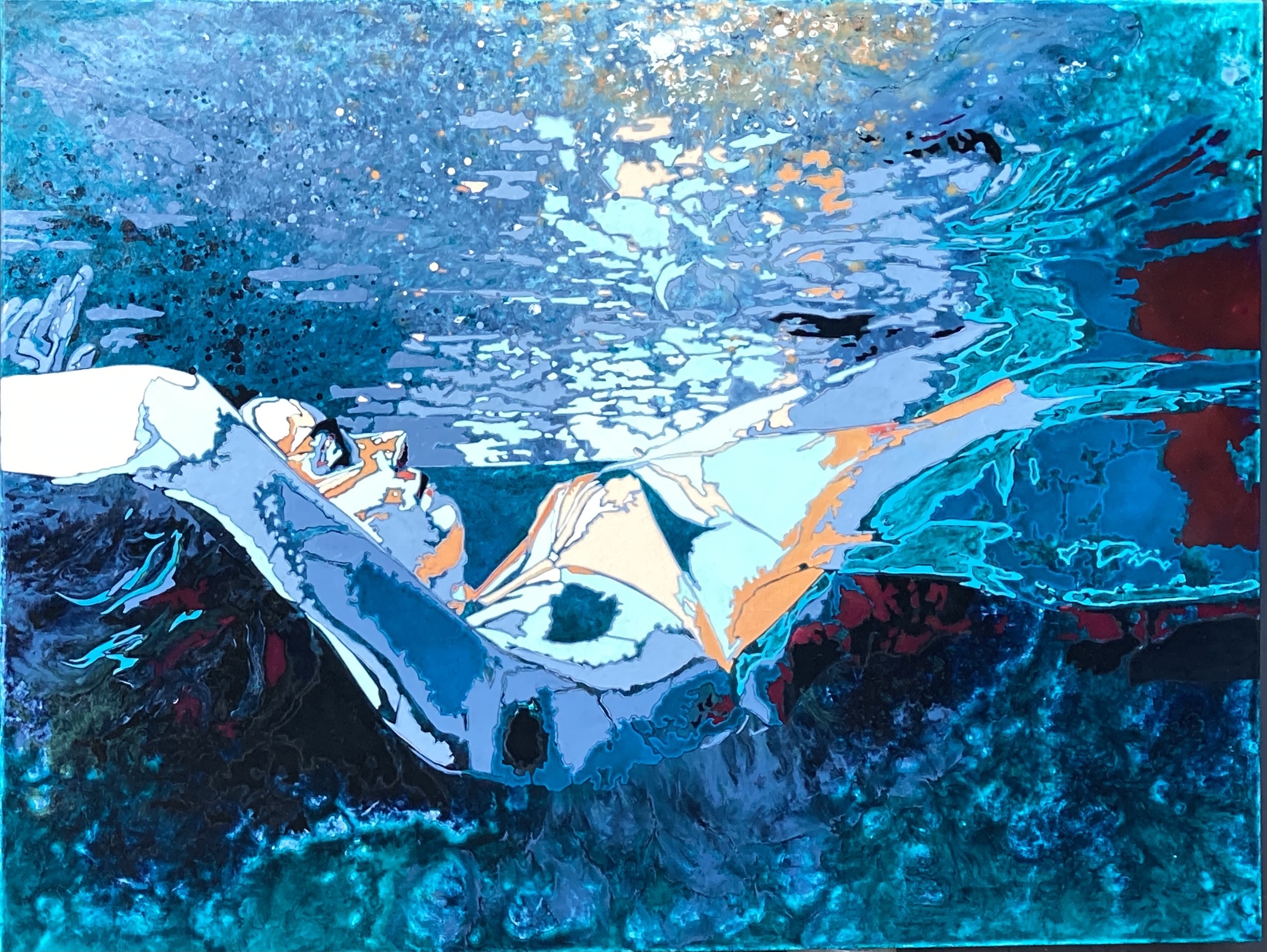 Inspired by the legends of King Arthur I wanted to capture the wondrous alternate universe of “The Lady of the Lake”. Drawing upon medieval literature and mythology, the Celtic goddess is said to lay just beneath the surface of the lake, appearing at times of need for the side of Good. Named after a line in Sir Walter Scott’s poem, ‘The Lady in the Lake’, I’ve used a contemporary approach using techniques such as expressionism and pop art to capture her in contrasting colours of teal and orange, along with cool greens and ocean blues. In this rectangular composition of an underwater world, the light highlights her face and her dress as she floats just under the surface.
