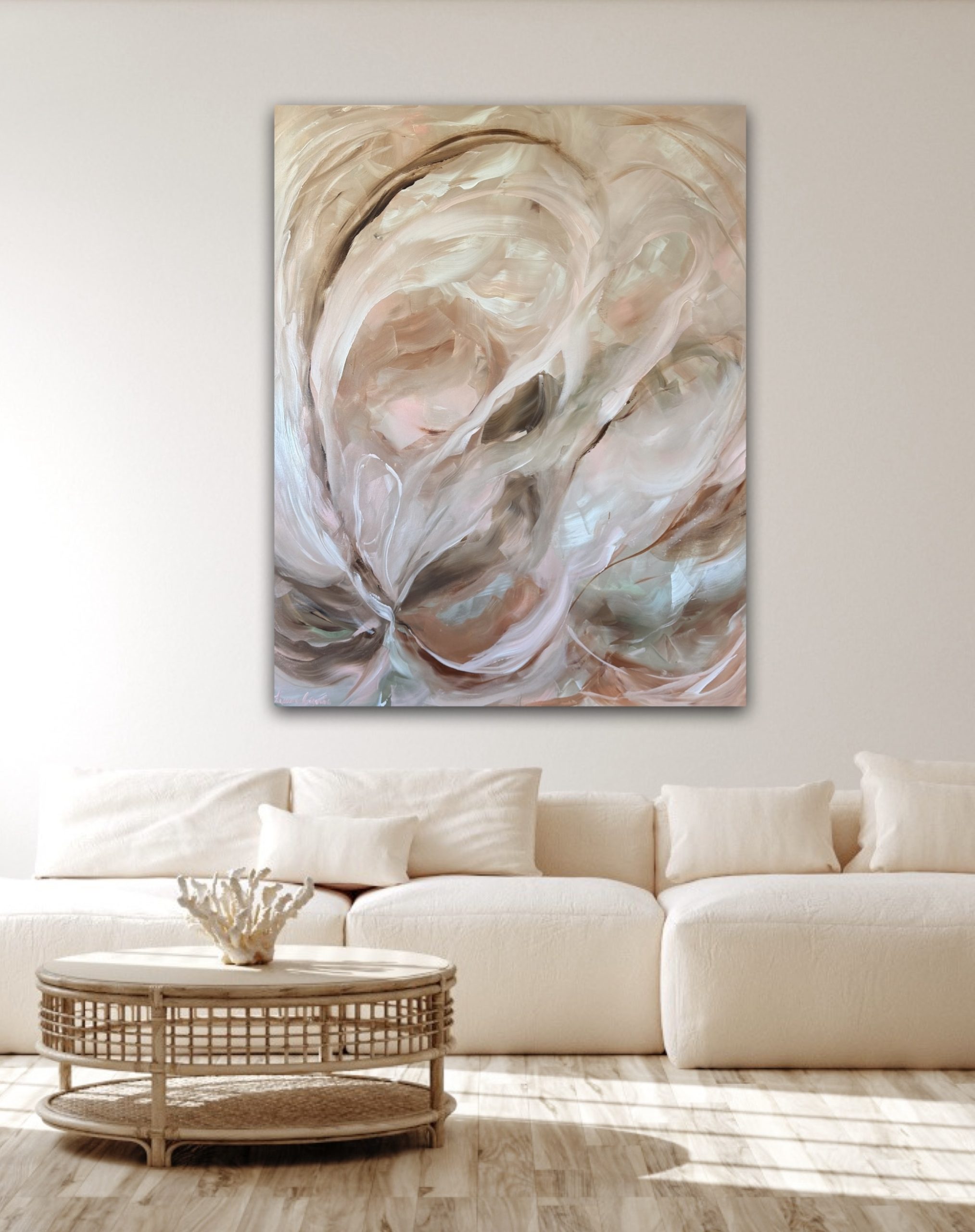 Inspired by the subtle beauty of nature’s quiet movements, the palette of soft blush and warm sand tones create a calming presence, making it a grounding centrepiece for any serene, light filled space.