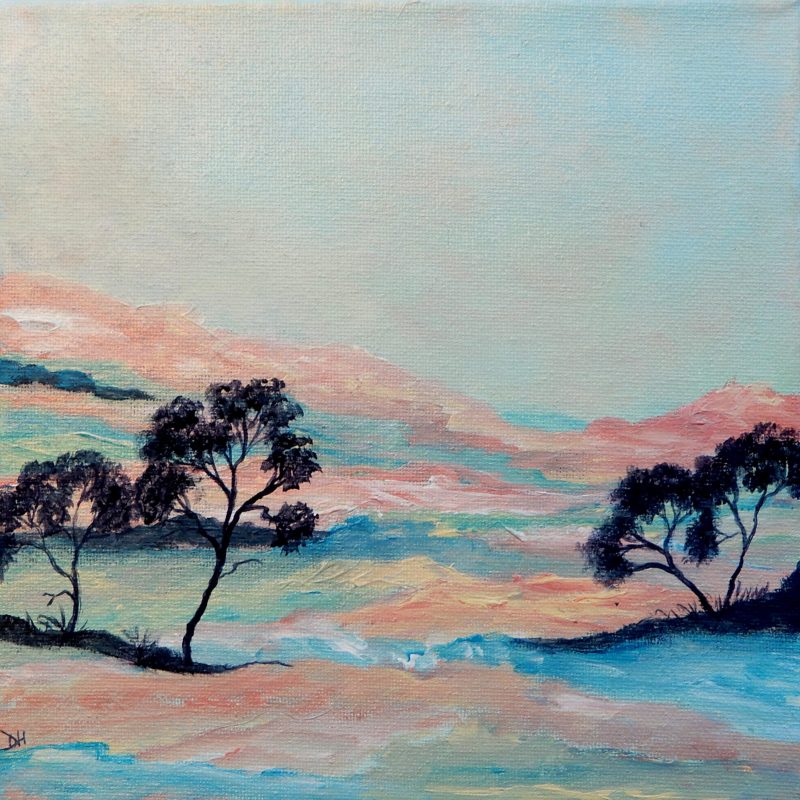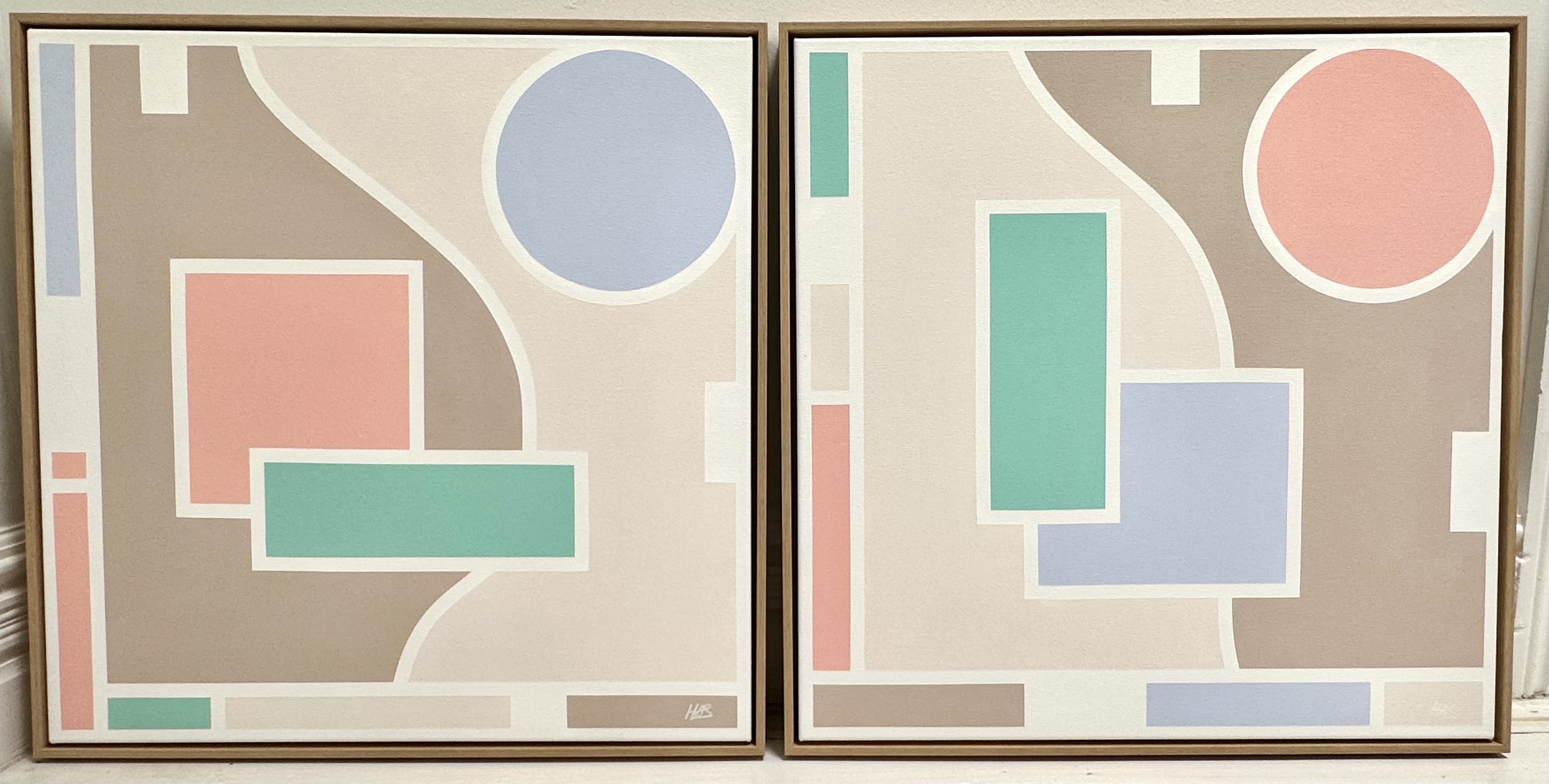 Soft Peace and Soft Love by Harriet Sheard – Soft Peace and Soft Love are a 2 piece, meant to be enjoyed together. Their pastel colours are warm and inviting. I wanted to produce a soft pallet for this diptyque that feels soft and harmonic together. Â Ready to hang, original acrylic on canvas painting with oak frame. Each canvas is 62cm x 62cmx 4.5cm. Â The paintings can also be sold separately for $800 each, please message me if you would like to buy just one.