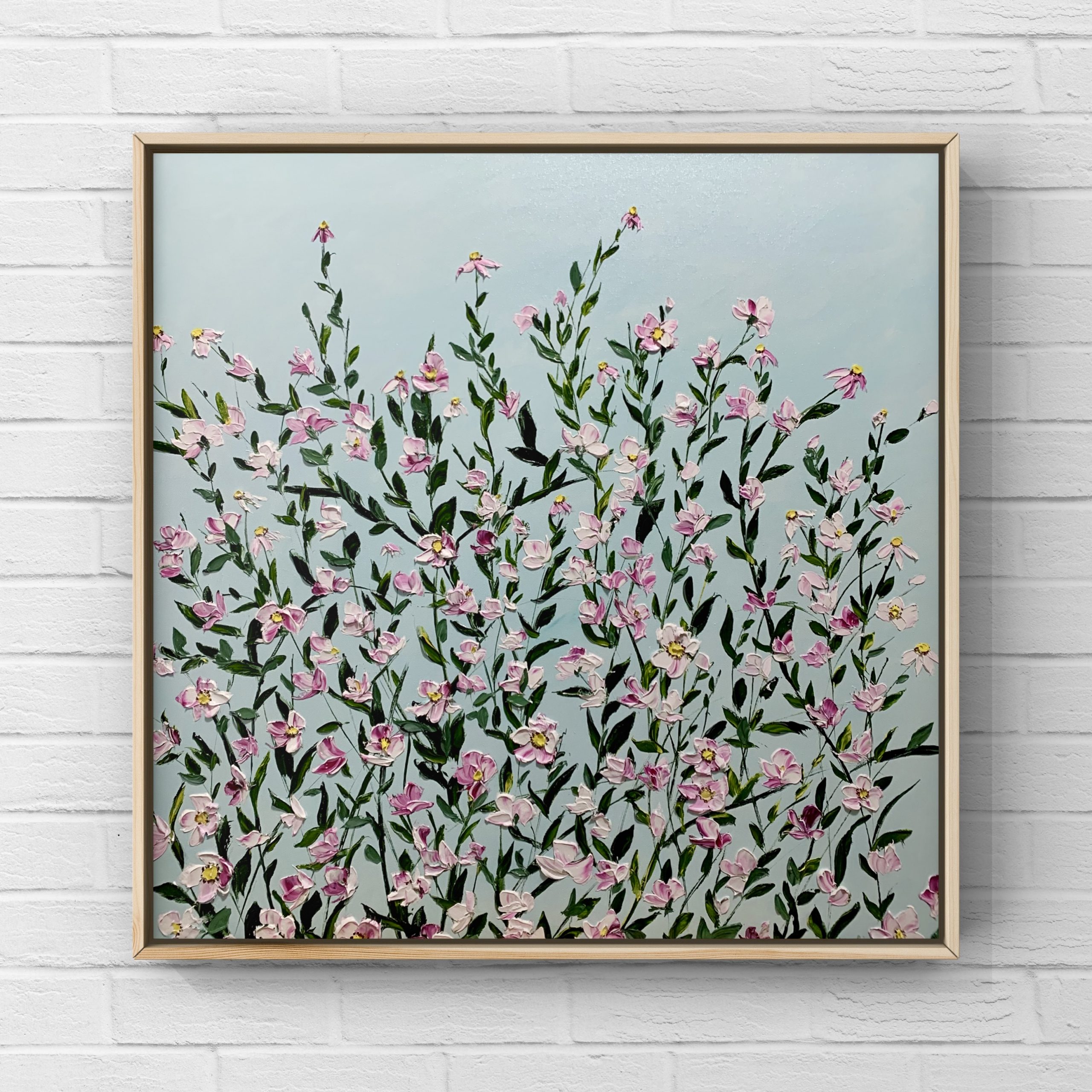 This artwork is 3rd in the soft petals series. It’s made using impasto technique with palette knife and is framed in ethically sourced ash wood floater frame.