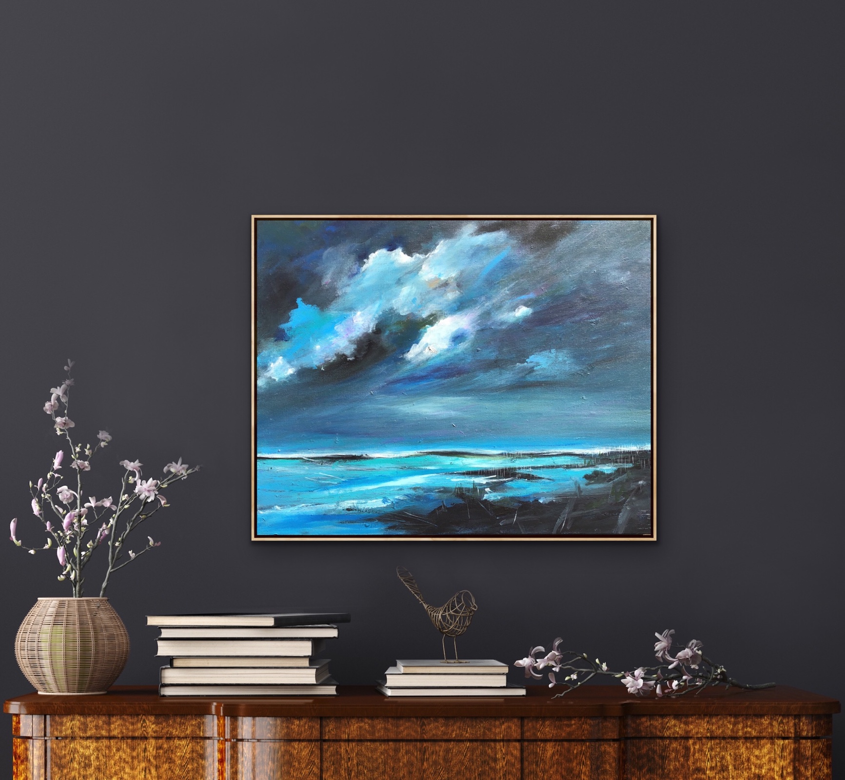 Solace is an original impressionist landscape that captures the mood of a turbulent stormy ocean. My hope is that this painting brings a sense of calm to the room where it lives, and that is makes the people who enter the room feel as though a part of nature is right there with them. Layered acrylics on a texture base on stretched cotton canvas. This painting is double glazed and is finished with blackened edges and is ready to hang. For an additional $100 the painting can be framed in a solid timber floating frame. Please let me know upon purchase if you’d like to take advantage of framing. The Artwork is stamped on the front, and signed and dated on the back. A Certificate of Authenticity is also provided.
