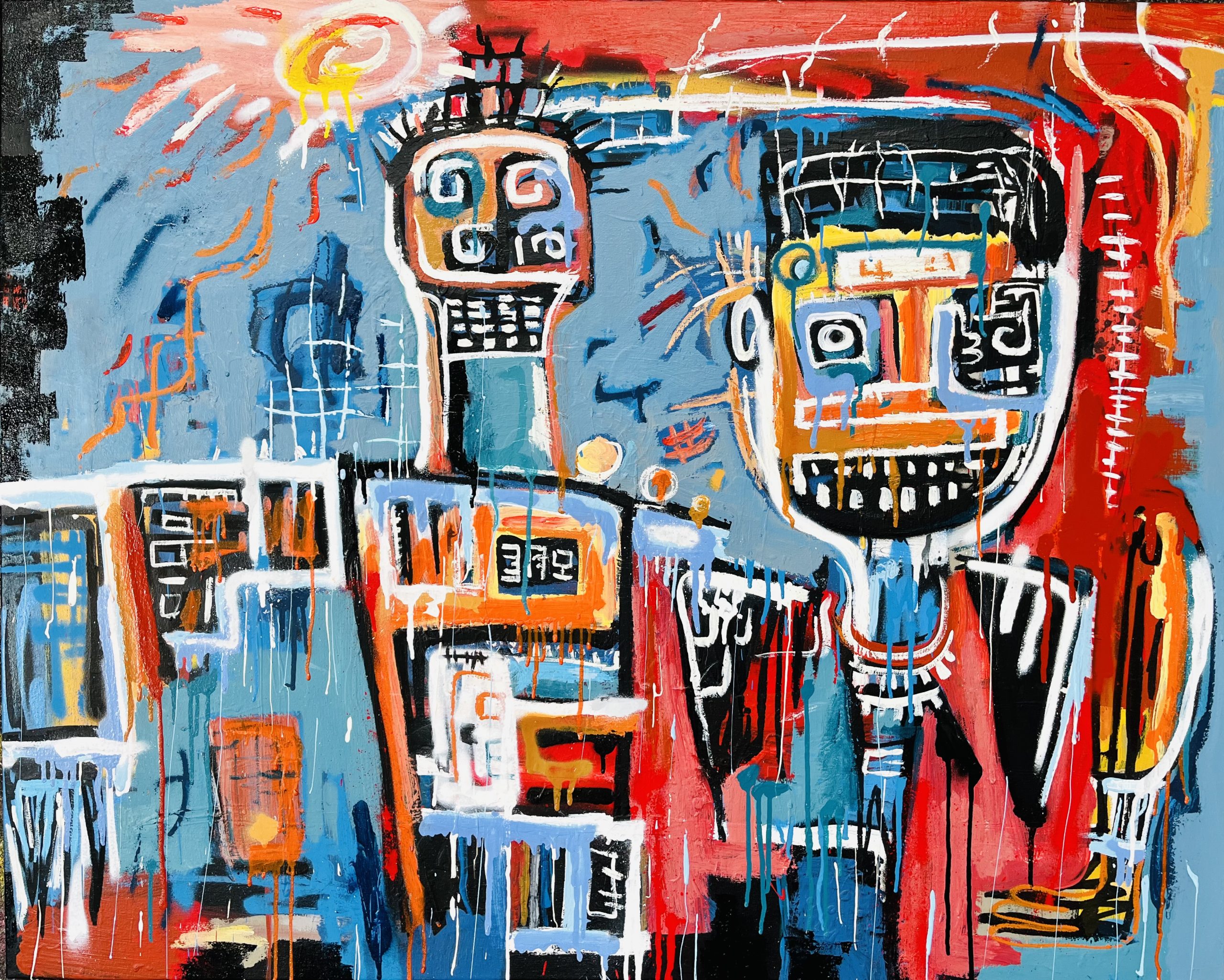 Grab a blender and add some pop art, expressionism, spray paint, ideas about robots and out of control Al taking over the world, and you will end up with an artwork that looks something like this, a Neo Pop statement piece and will give maximum impact to any room.