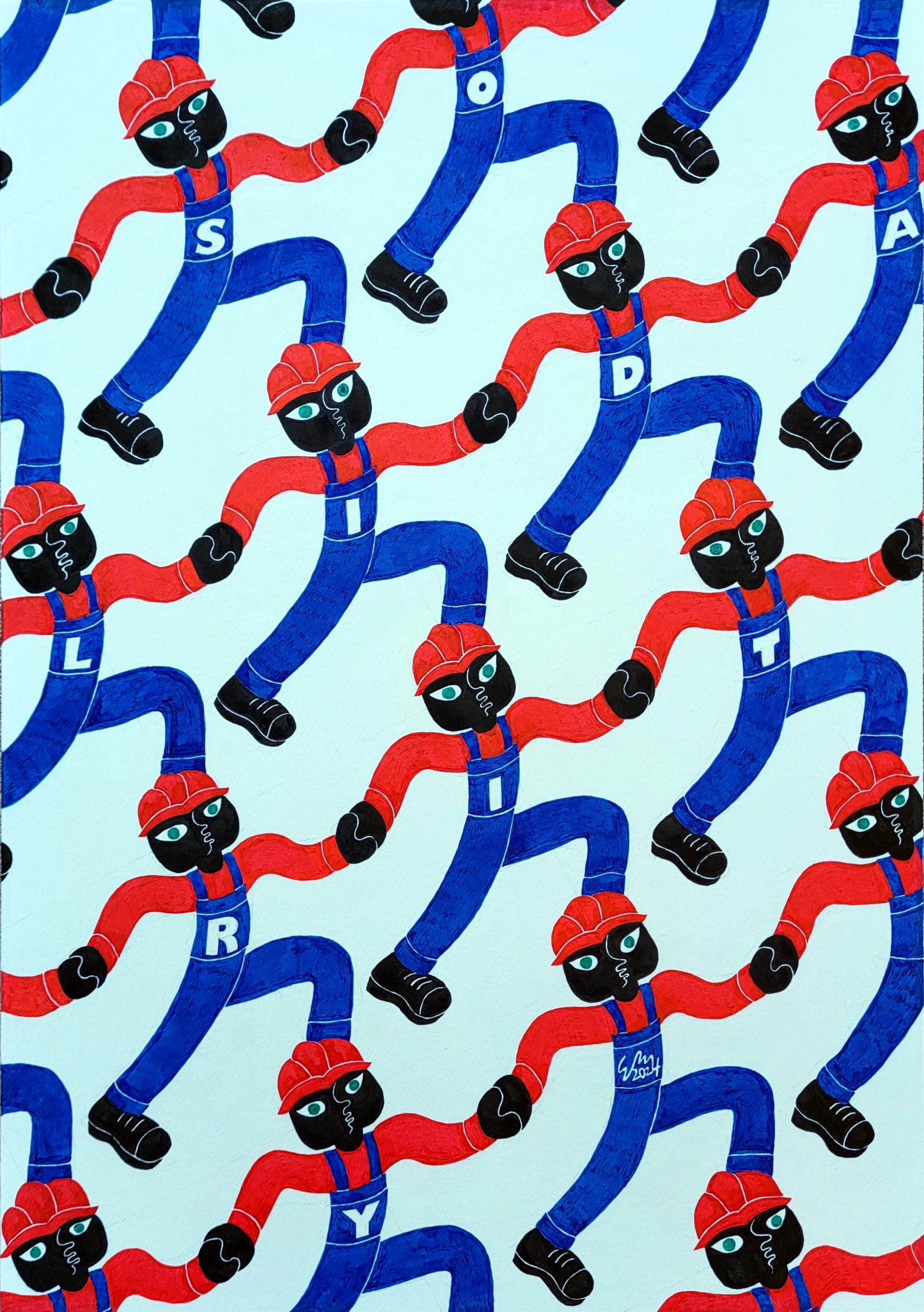The letters on the chest of the overalls worn by the workers in the picture form the word SOLIDARITY (from top to bottom, left to right). The last one (lower right) is the artist’s signature and date.