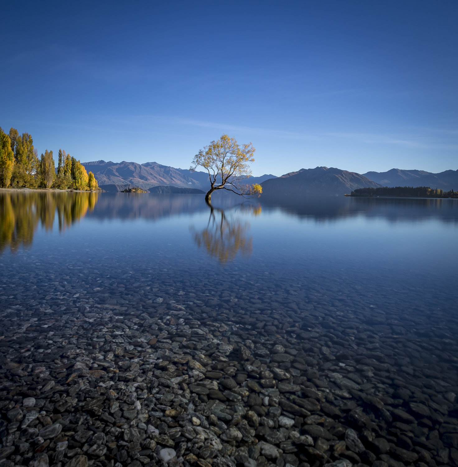 Captured at the iconic willow tree of Lake Wanaka, New Zealand, this photograph invites the viewer into a moment of serene reflection. The crystal-clear waters reveal smooth pebbles beneath the surface, grounding the scene in quiet detail. A solitary golden tree stands partially submerged, its delicate branches mirrored perfectly in the still lake — a symbol of resilience and grace. Framed by distant mountains and autumn foliage, the deep blues and warm yellows create a striking contrast that evokes peace, tranquility, and natural splendour. This piece is ideal for collectors seeking calm, balance, and a connection to nature’s quiet power.