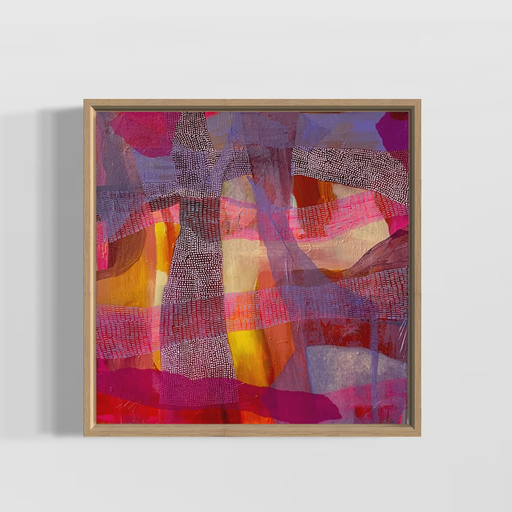 This was created by building layers of medium; first acrylic glazes then ink washes and acrylic paint. There are also layers of intricate pattern and mark making which is done to both contrast and compliment the paint layers. There is an additional layer of collage in the form of hand dyed paper. This adds a shadowy impression across the work and is in a lilac shade. Due to this layering technique, this wok has an incredible amount of depth, with various areas of the under painting visible. This work is bold and impactful but the subdued colour palette also makes it very livable. There are vibrant areas of magenta, lilac and coral and contrasting ares of maroon, plum and deep violet. There are also warm areas of ochre and white. This painting would work well in as part of a ‘galley wall’ display or a as a single painting in an area such as above a bedside table. They also sit well as decorative objects on bookshelves or mantles.