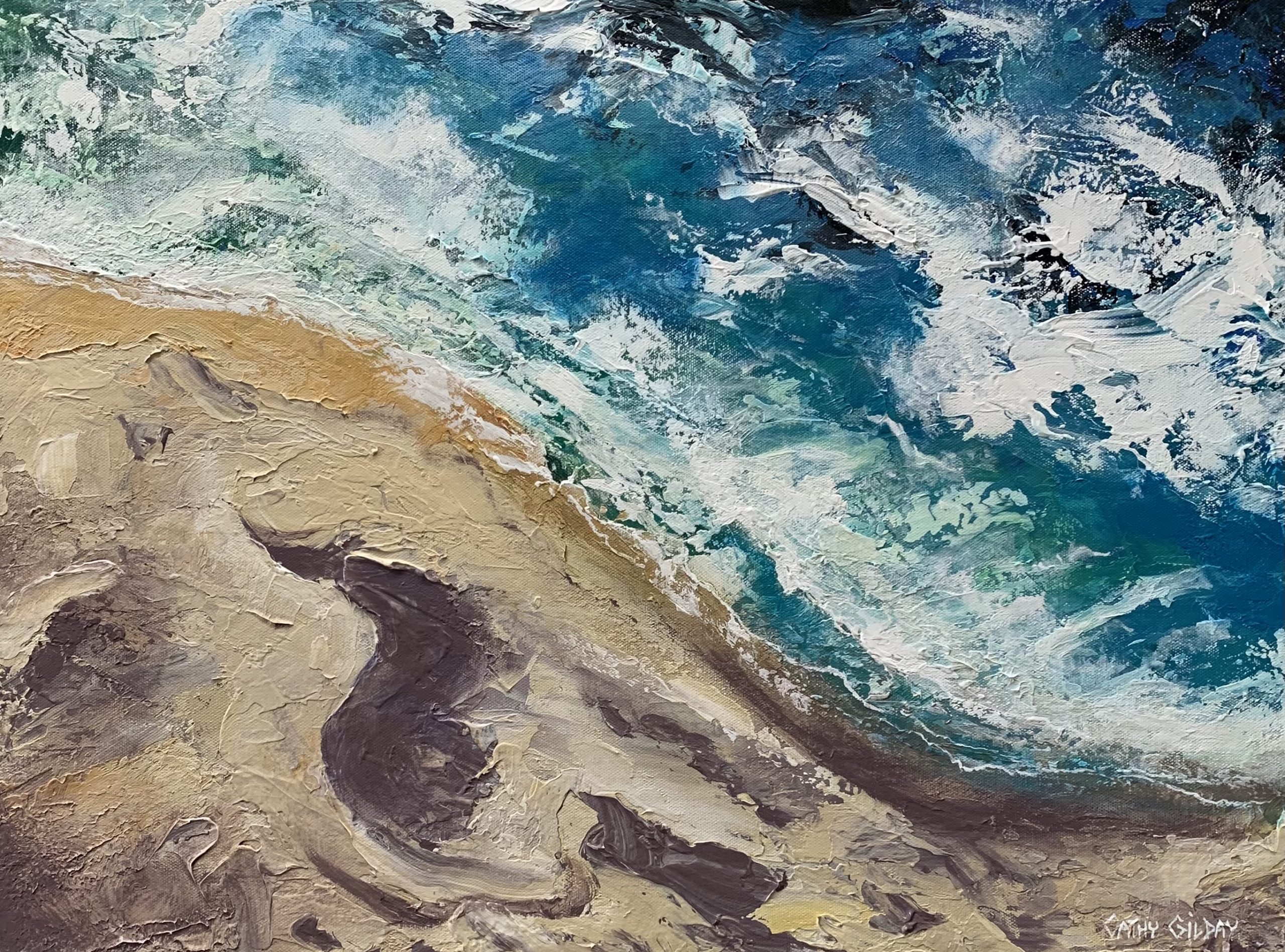 Solitude on Straddie  by Cathy Gilday-A heavily textured, impressionistic painting of Stradbroke Island, otherwise known as Straddie, from an aerial perspective. I have used acrylic with both palette knife application and brush, on stretched canvas.