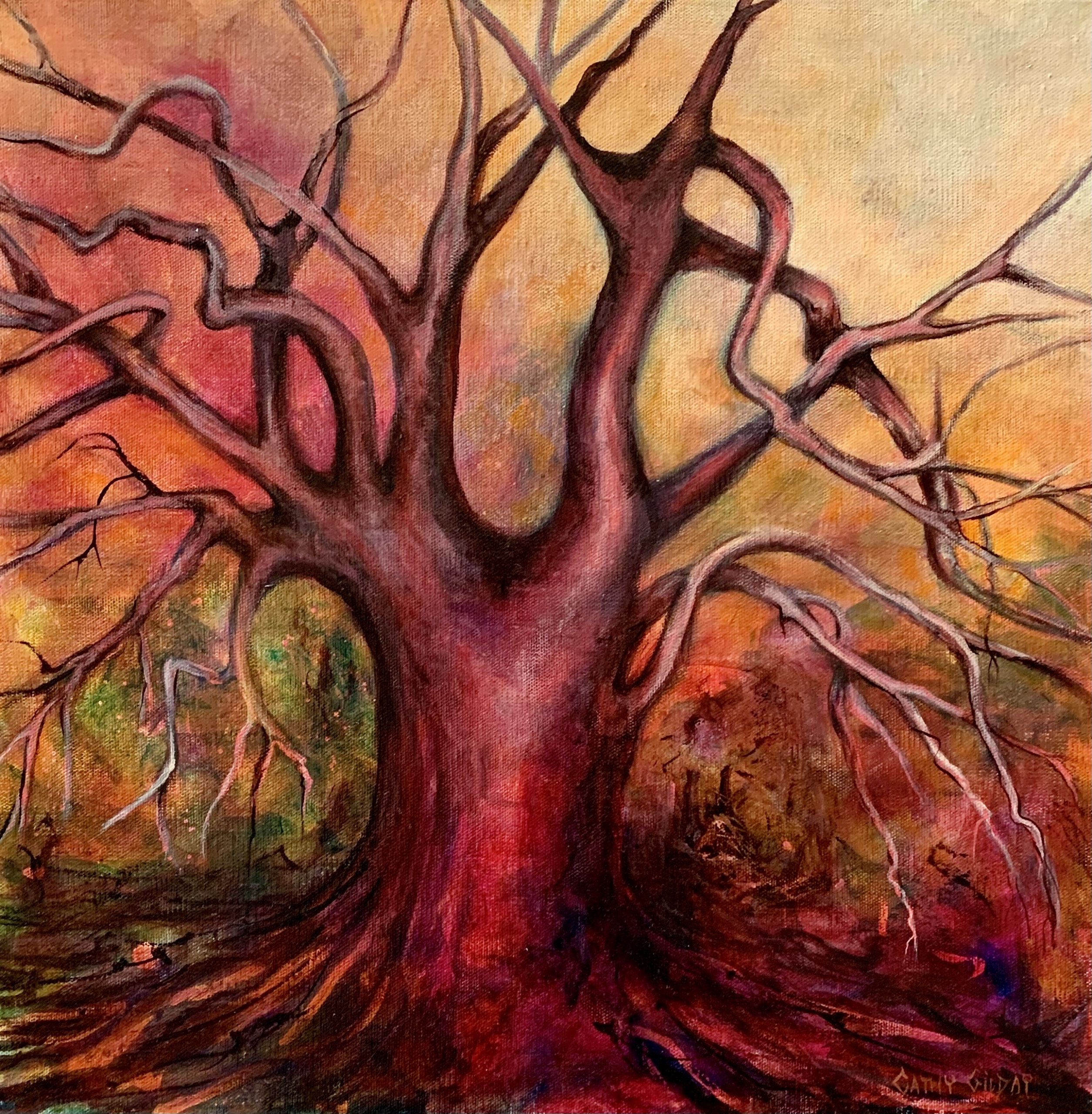 For me, trees are a symbol of life. Bathed in beautiful colourful glazes, this one is standing proud, with its bare and twisted branches, reaching every which way. Sides painted.