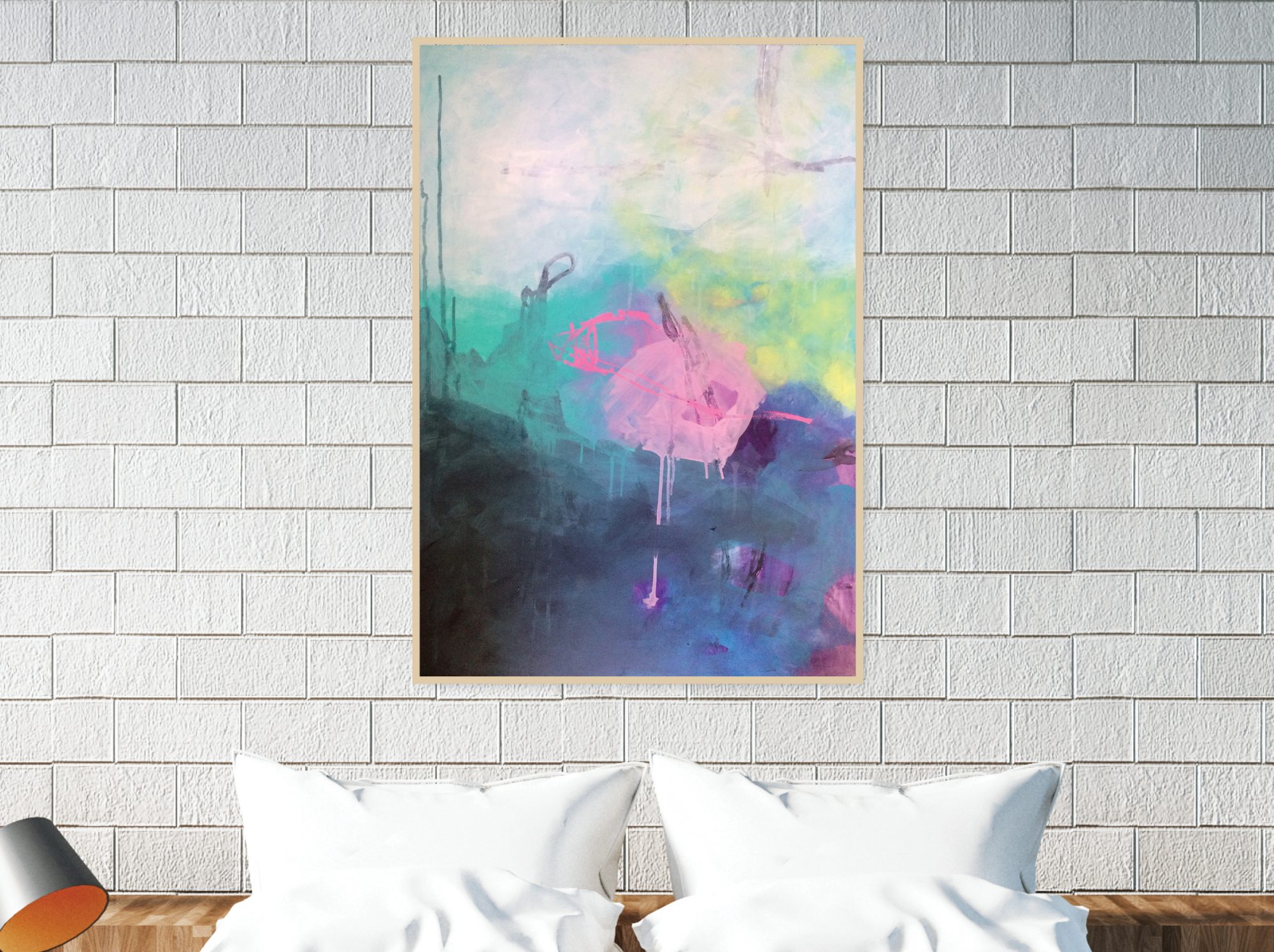 Looking for a modern contemporary abstract painting? This original painting won a Highly Commended Award in the prestigious Rockingham Art Awards 2017. It measures 60cm wide x 90cm high, professionally framed with gorgeous 2cm light oak. As it is painted onto wood, it has no glass covering it. The materials are acrylic paint and oil stick, finished with three coats of varnish, so easy to dust if required. Ready to hang.