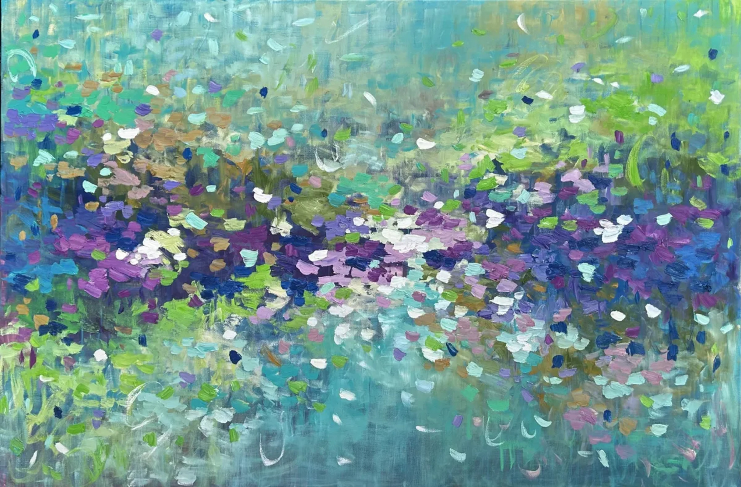 This abstract oil painting is a mesmerizing blend of ethereal greens, deep purples, and dark blues, creating a moody and captivating atmosphere. The interplay of shades evokes a sense of mystery and depth, as if the painting is a window into a dreamlike, otherworldly landscape.