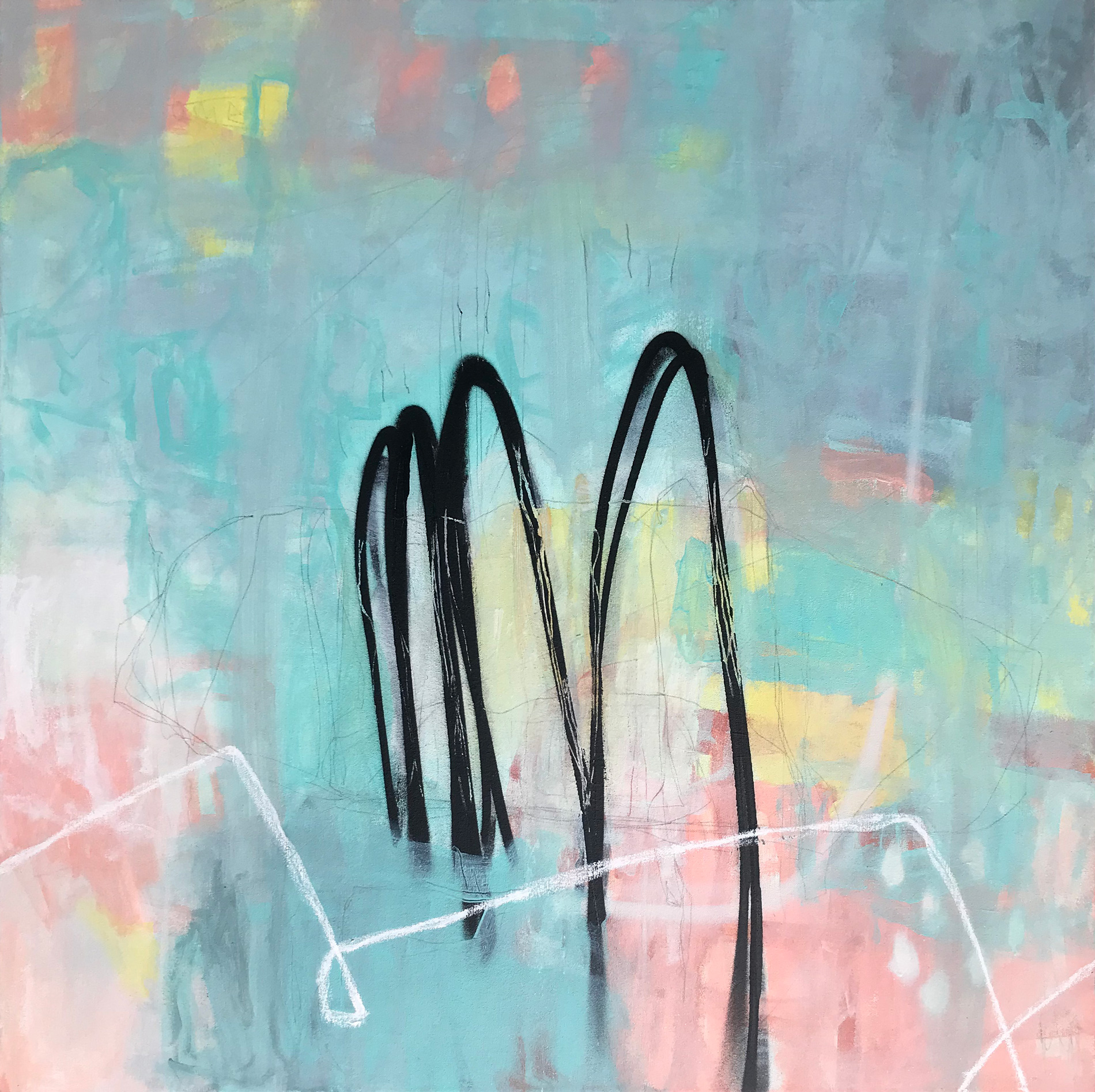 Pastel blue, pale yellow and apricot form the base for this multi-layered original abstract painting. Between the layers are hidden words, emotive marks and evident brush strokes. All depicting the joy I felt when creating this piece. The black aerosol shows the movement of spraying the central detail. The white ‘energy line’ over the top binds the layers together and creates an eye-catching, visually balanced painting. Whatever you’re looking for in life, I believe this painting will aid in your journey, enriching your life with joy.