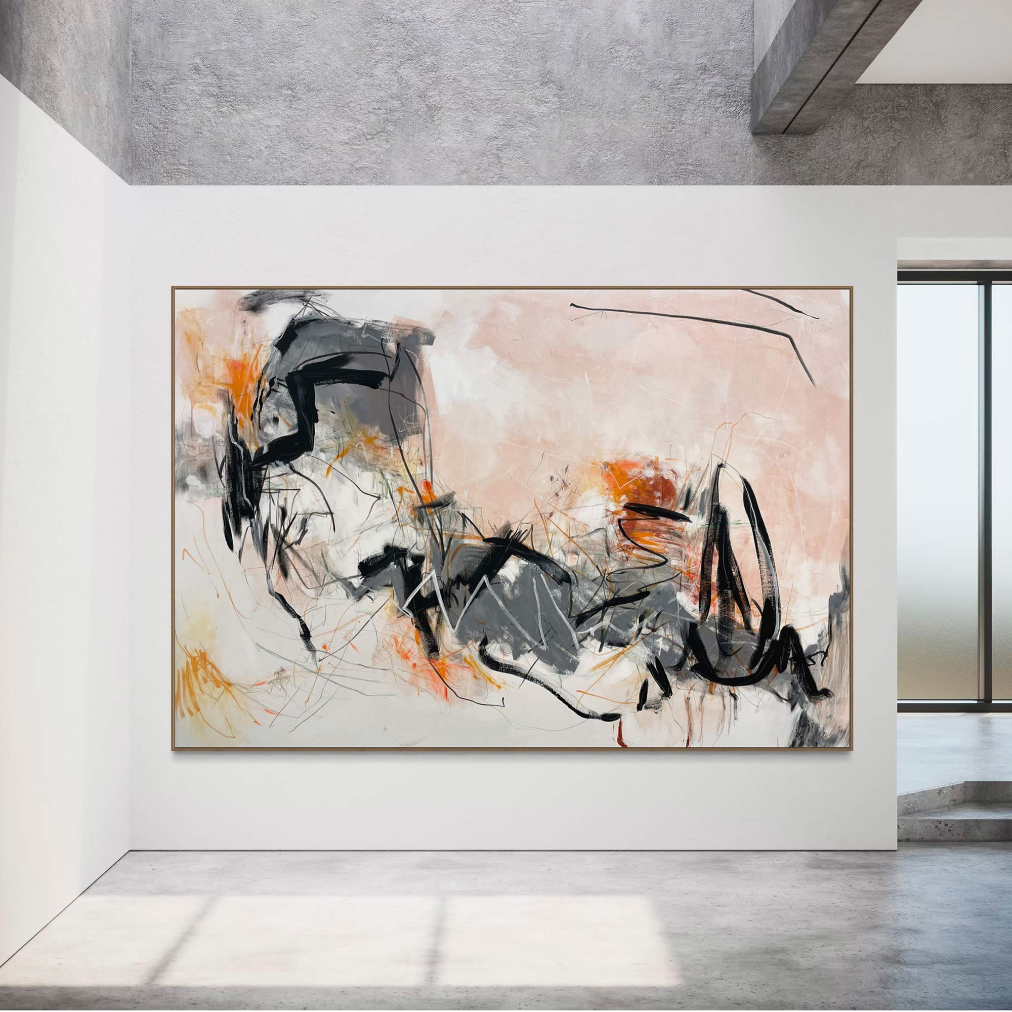 This extra large painting combines intuitive mark making with layering of thin washes to create this striking artwork, at home in any space. The palette consists of orange, ochre, beige, and white with cool grey, and black and graduated pale coral pinks contrasted with subtle pops of olive and bright greens.