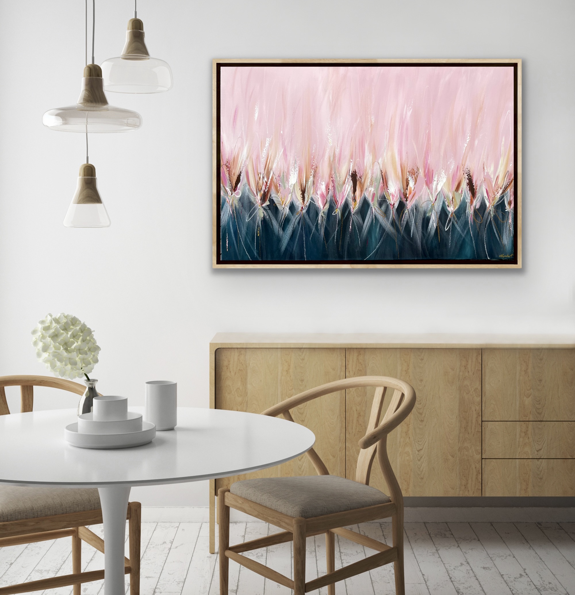 This striking statement piece is bold yet has a soft fragility to it and would be a stunning focal point in any space. It has painted wrap around sides so is listed at an unframed price, however if you’d like it framed in natural timber, please get in touch.