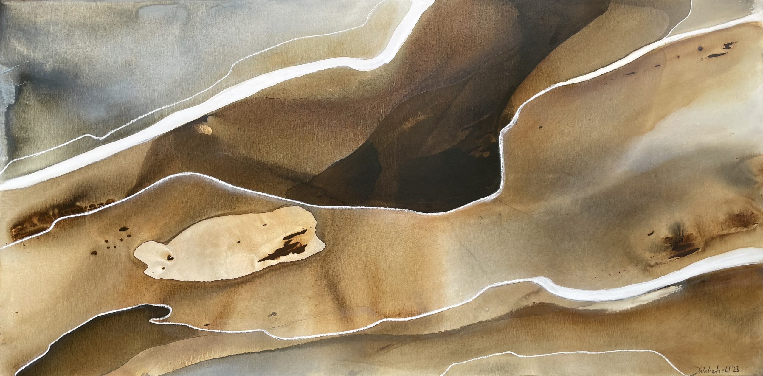 Sorrento 2 by Dinah Wakefield is inspired by the light, the colours and the natural beauty of the Noosa region of Australia. “What I love most about Noosa is the interplay of light. From the oceans to the clouds, to the river estuaries and the hinterland, this canvas unfolds before me every day and finds expression in my paintings”.