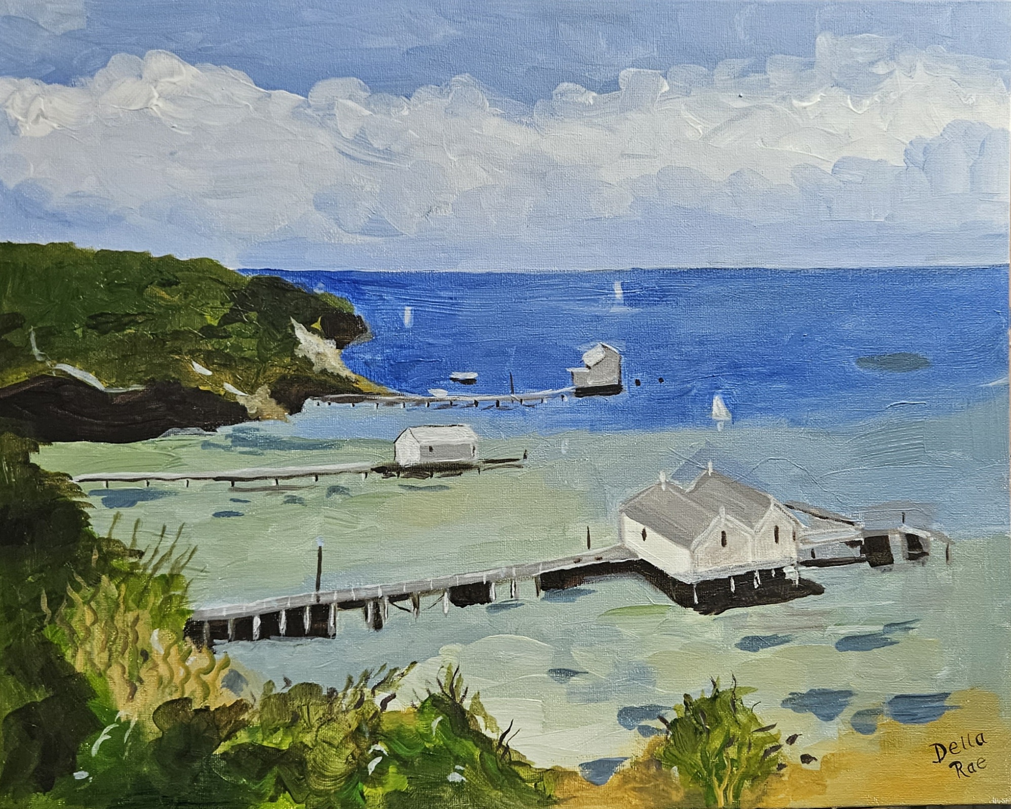 A lovely, relaxing scene to paint. I love sea views and the thought of boats coming and going from these piers. I often paint in oils, but chose acrylic paint in this instance, to challenge myself to use a different medium.