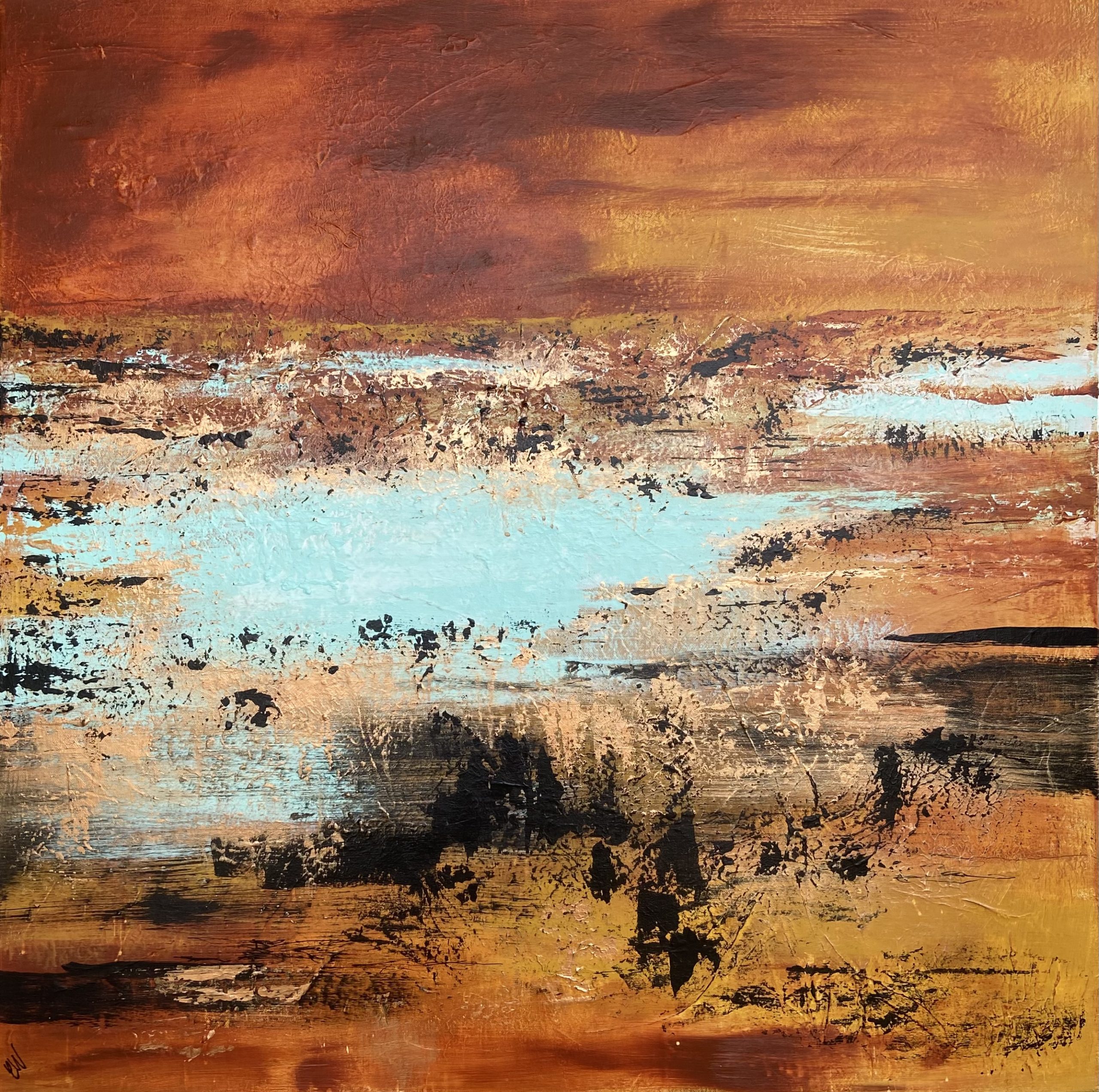 Soul Searching by Carrie Welsh is a beautifully textured abstract landscape, full of shimmering metallic bronze accents. 91.4 x 91.4 x 2 cm. Acrylic on canvas, ready to hang. Frame not included.