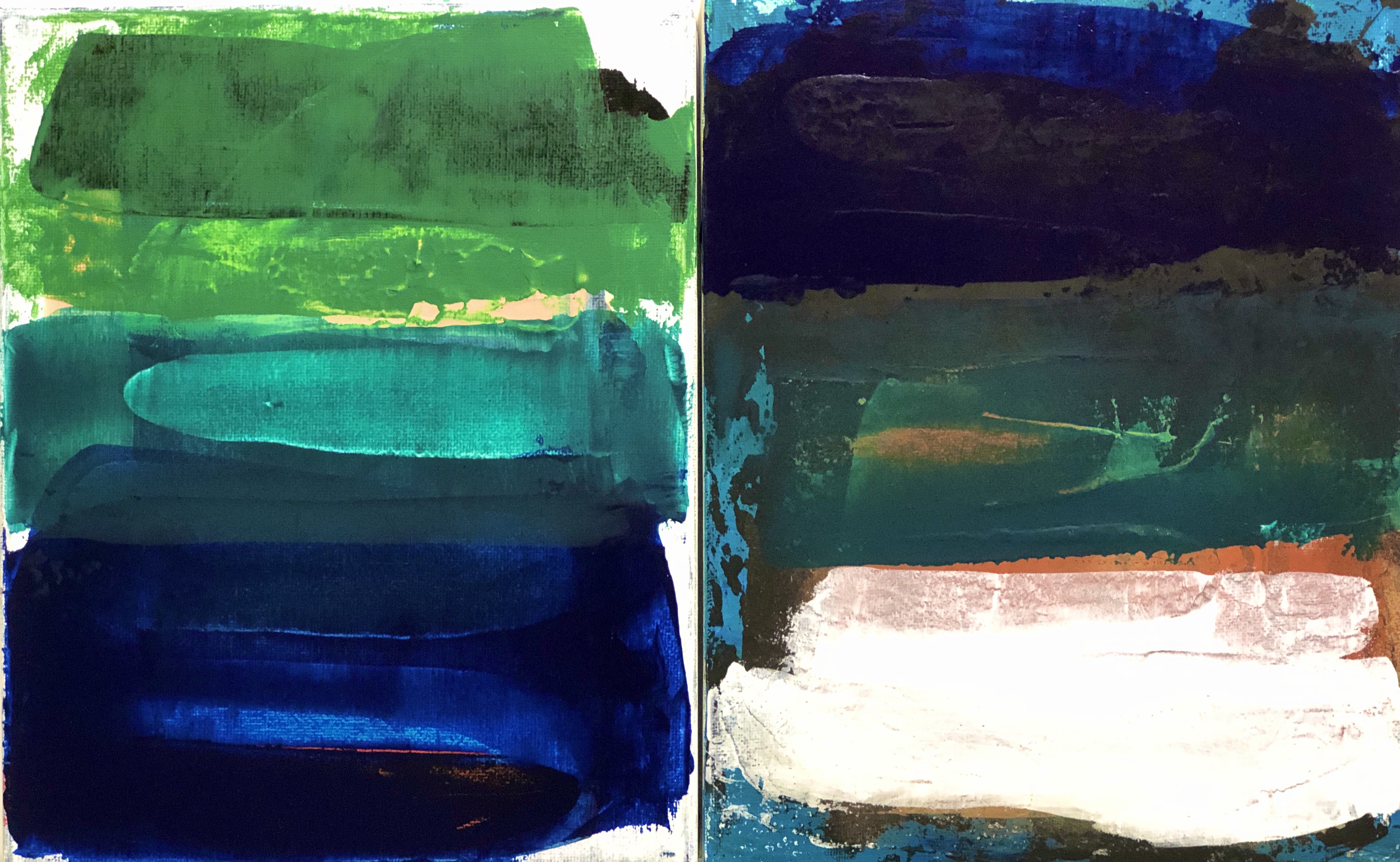 These 2 lovely abstract paintings are from the Soulmates series. They are acrylic on canvas, each wired ready to hang either together as a diptych, ( 2 paintings together making total dimensions 40cm W x 26cm H ) or apart much like Soulmates sometimes are. (each separate painting 20cm W x 26m H)
