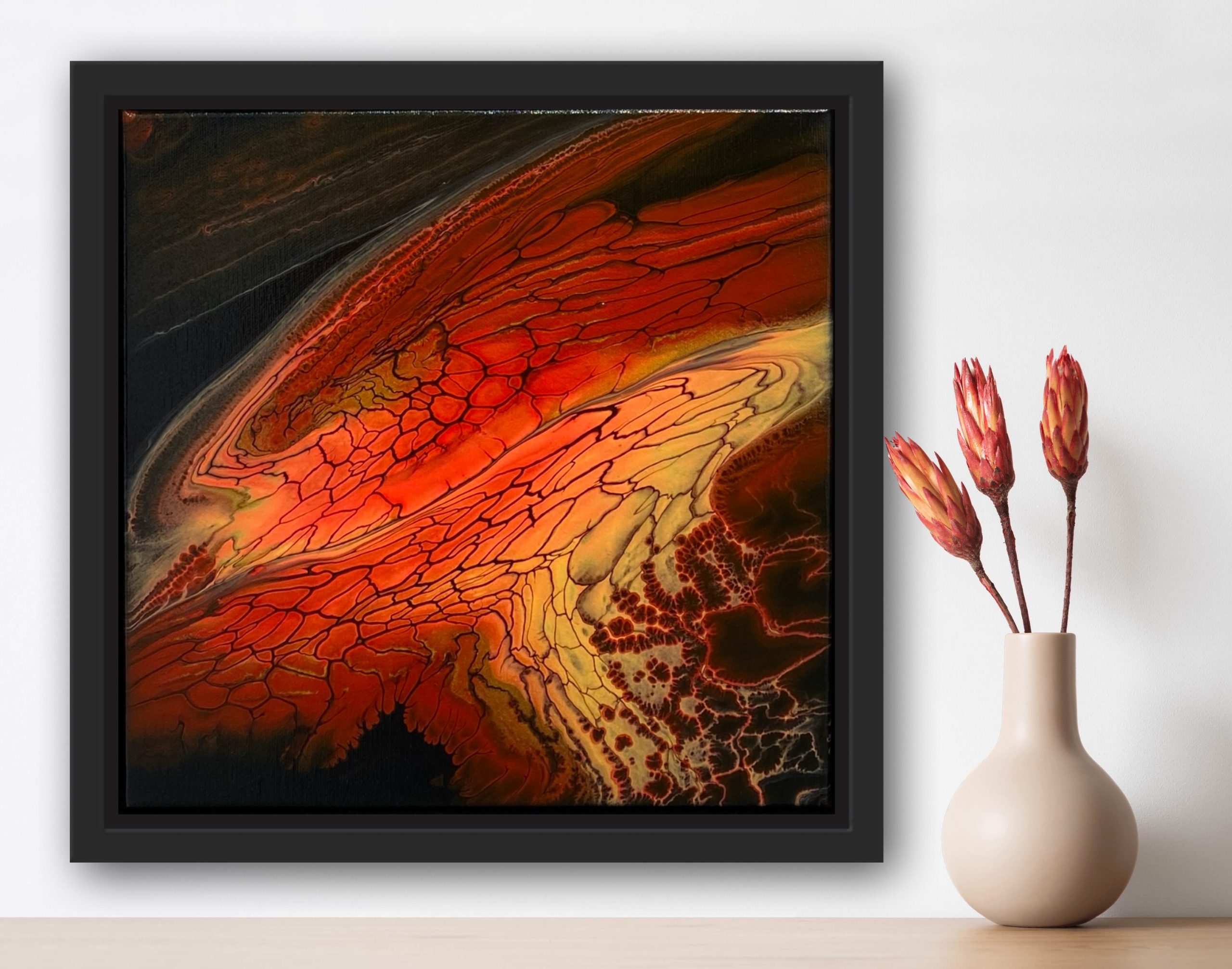 This is the second piece in my two part series called Souls Aflame. Both pieces are original stand alone vibrant red and gold swipes ‘burning through’ on black backgrounds, but also work beautifully as a set as shown in the in-situ images.