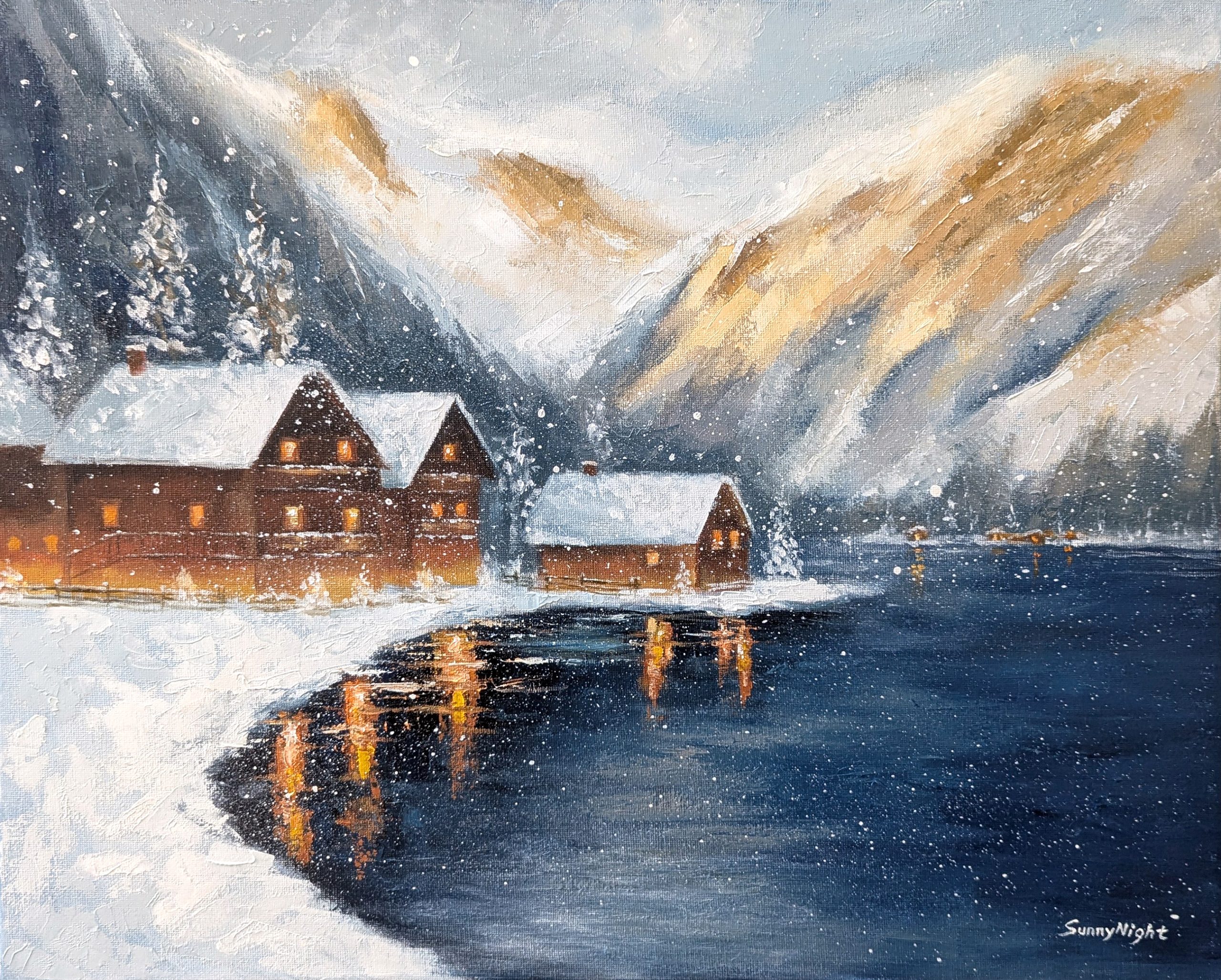 Oil Impasto paint winter lakeside landscape with multi-tools