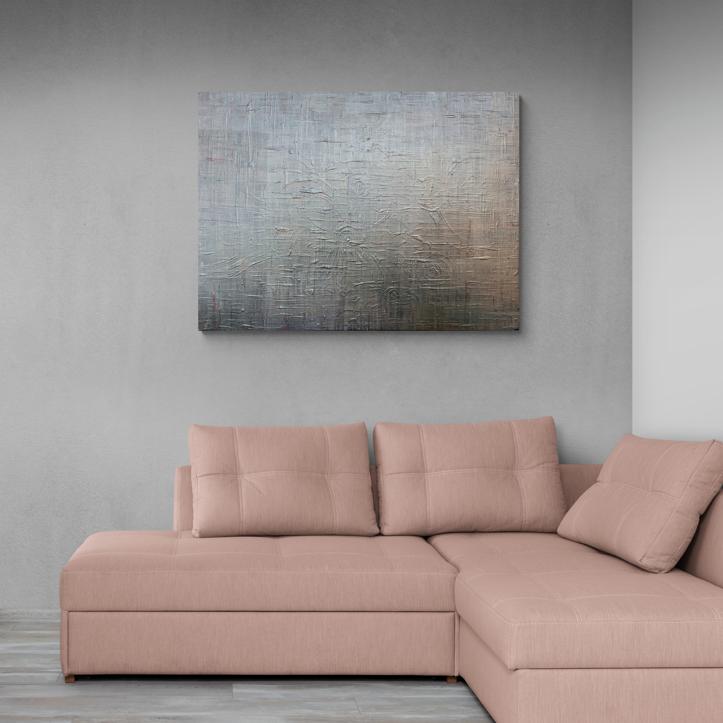 Heavily textured and multi-layered, this futuristic metallic abstract captures the energy and essence of natural evolution. A collaboration between man and environment.