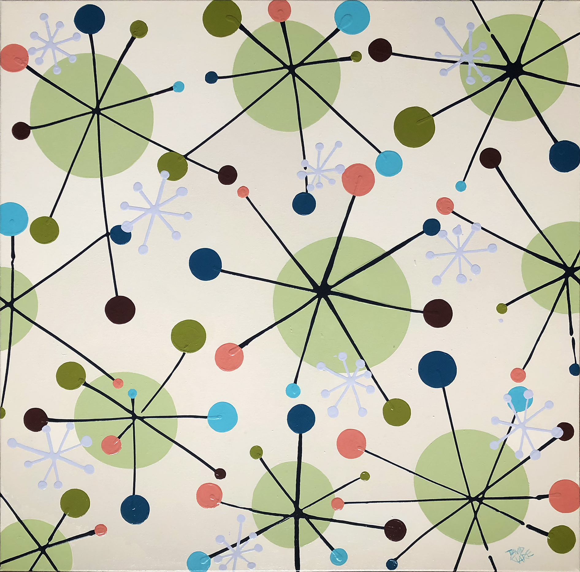 From my series of paintings inspired by Mid Century Modernism. I love playing around with these off-beat shapes and colours that are inspired by 50’s and 60’s architecture and art. The carefully hand painted shapes are highlighted with carefree drips of paint to add some unpredictability. It would have been such an exciting time to be creating new ideas. The freedom to design whatever your mind can come up with has helped me break out from the norm, and avoid the mainstream. These might not suit the beige, cream, off-white styles that I see in most interiors, but they will definitely make an impact. Lots of fun, and most importantly….lots of colour!