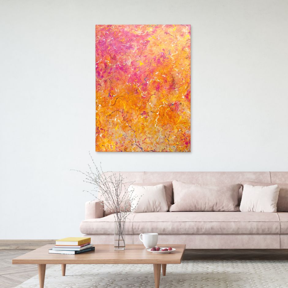 Spark 2 by Dessie O’Gorman – An original abstract painting showcasing a cloudy blend of autumnal colours, accented by sparks of bold colour. Triple gloss finish.