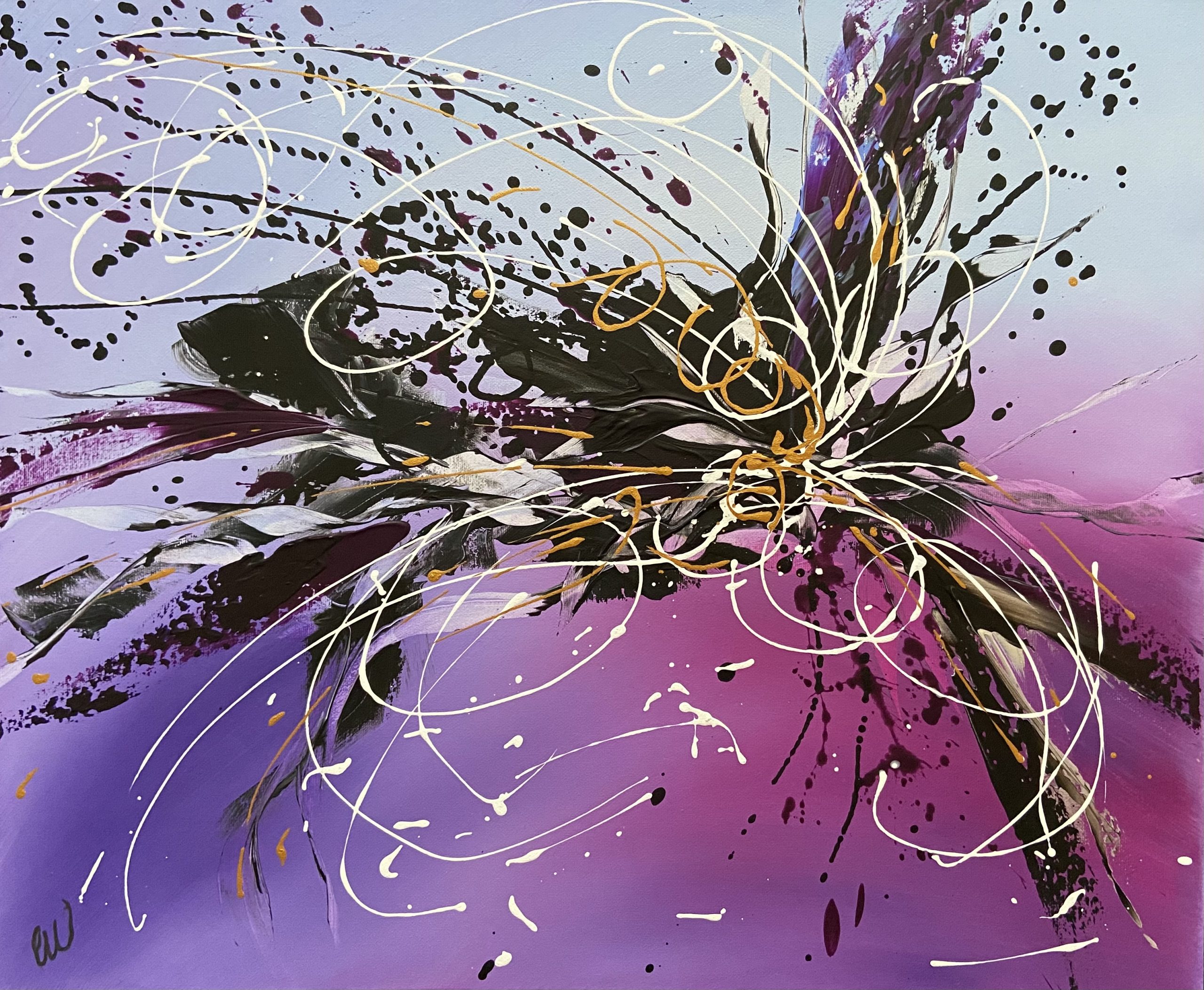 Spark by Carrie Welsh is a striking abstract piece with beautiful soft background colours while also being very bold and energy filled everywhere else! Gold accents highlight this painting. Lots of beautiful movement in this piece. 50 x 60 cm. Acrylic on canvas, ready to hang.