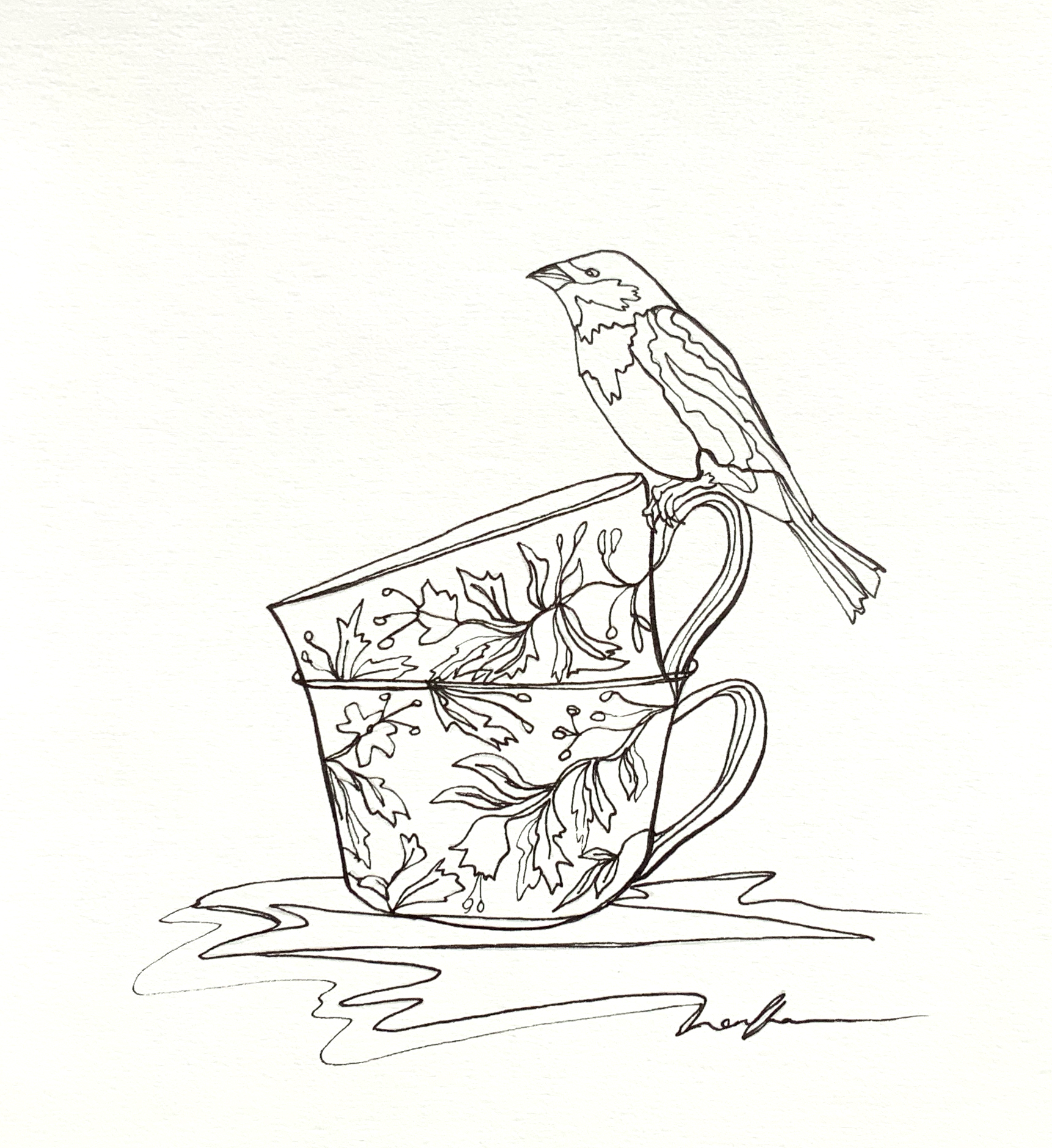 An original line art drawing of a sparrow sitting on two tea cups, by Sydney artist and illustrator Leni Kae. The sparrow brings a message of finding joy in the simple things in life; communication and bonding with family and loved ones. Wonderful small minimalistic line-art design in monotone black and white. Created in ink on 300gsm paper.