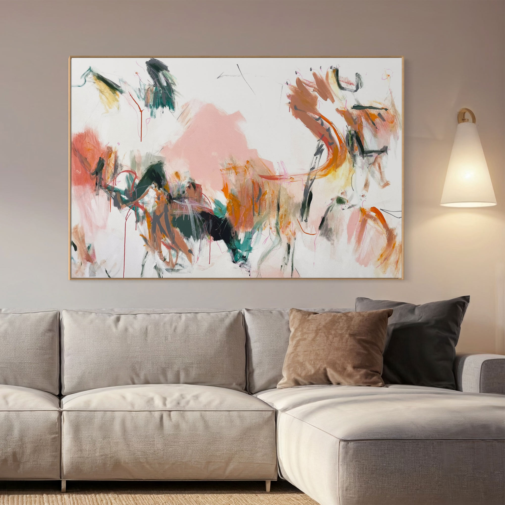 It’s a colourful uplifting piece. It’s intriguing mark making combined with its striking palette of beautiful soft apricot, blush and pinks, sage green and orange, mixed with white and sage with pops of bright and and dark greens, olive, black and grey line work.