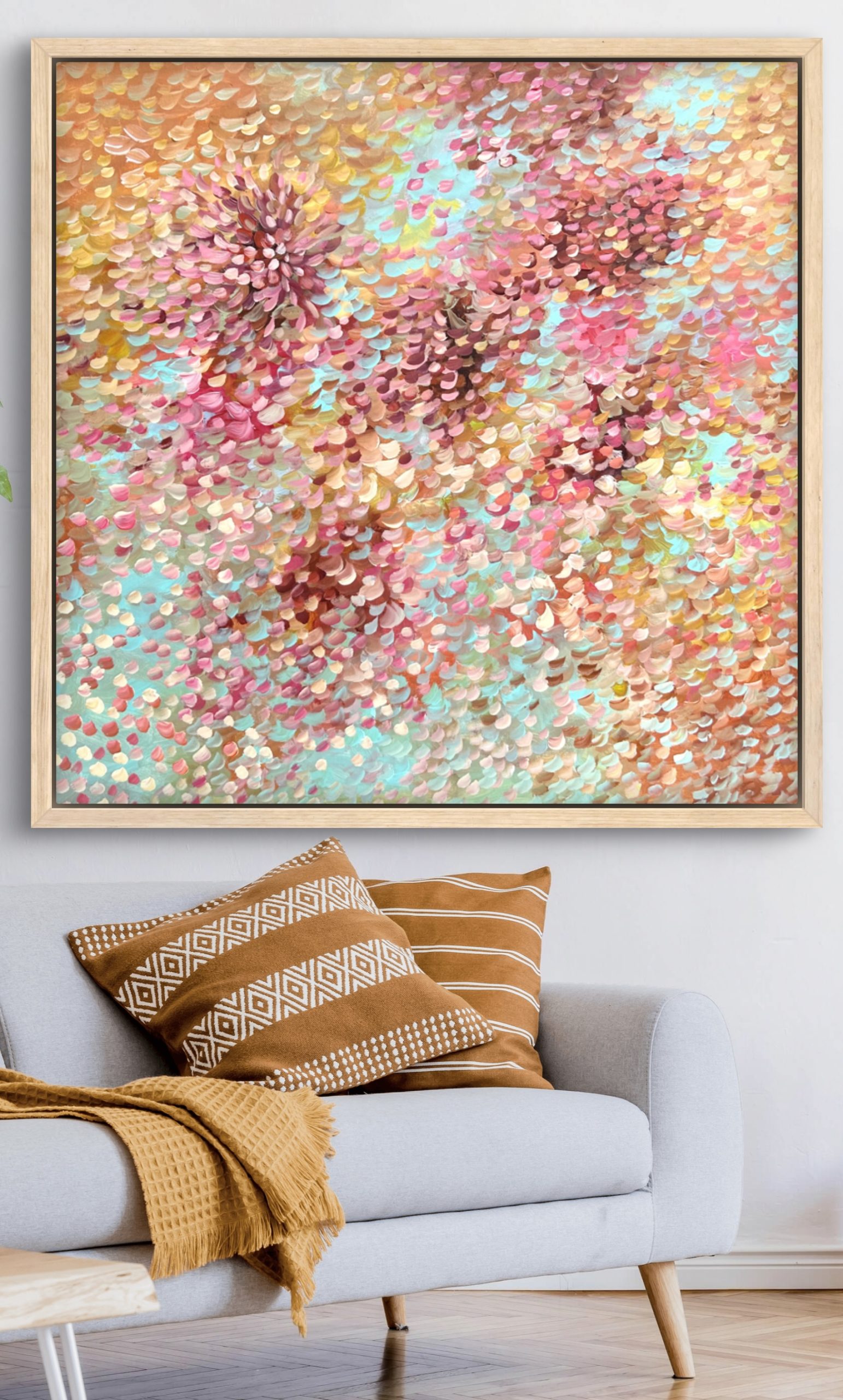 Special Moments by Theo Papathomas a painting with warm and cool colours of petals flying in the wind creating this beautiful carpet of petals over the landscape with lots of layers of acrylic paint. Petals weeping over the landscape creating so much movement and rhythms . A very peaceful and tranquil painting with so much depth. The painting does not come with an external frame.The painting is signed and dated at the back and comes with a certificate of Authenticity.