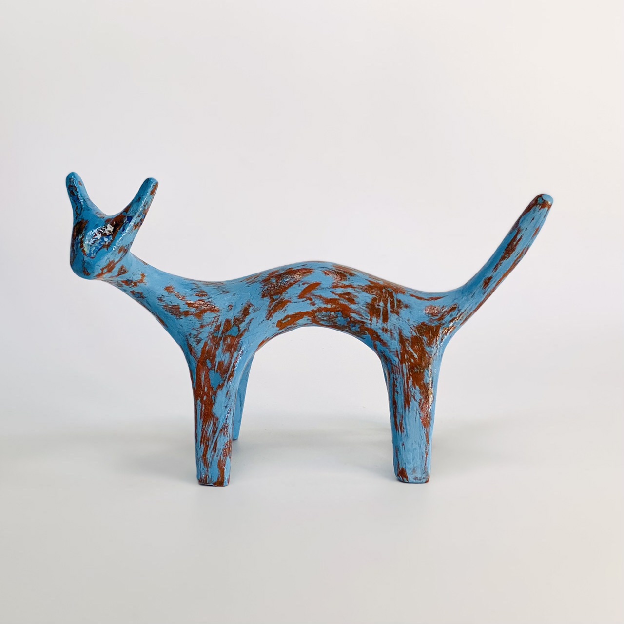 Speckled Cat by stefan Mager – Elegant blue/terracotta cat glazed and finished with various techniques.
