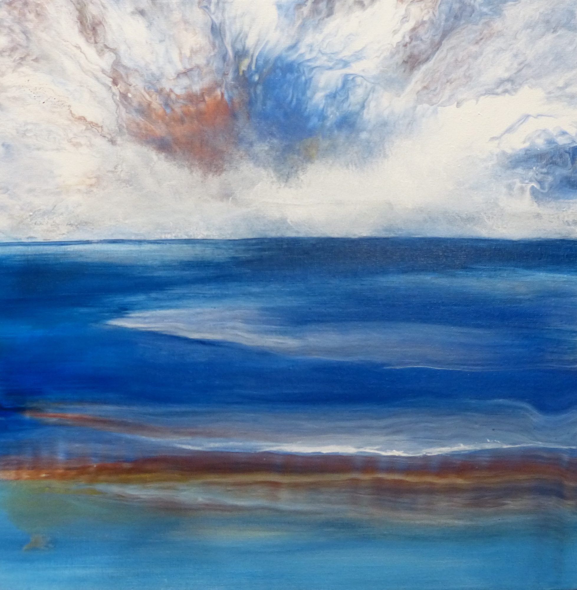 This small abstract seascape is a fluid acrylic painting inspired by the beautiful skies seen up the Noosa River at sunset. It is an abstract impression done with flow art techniques.