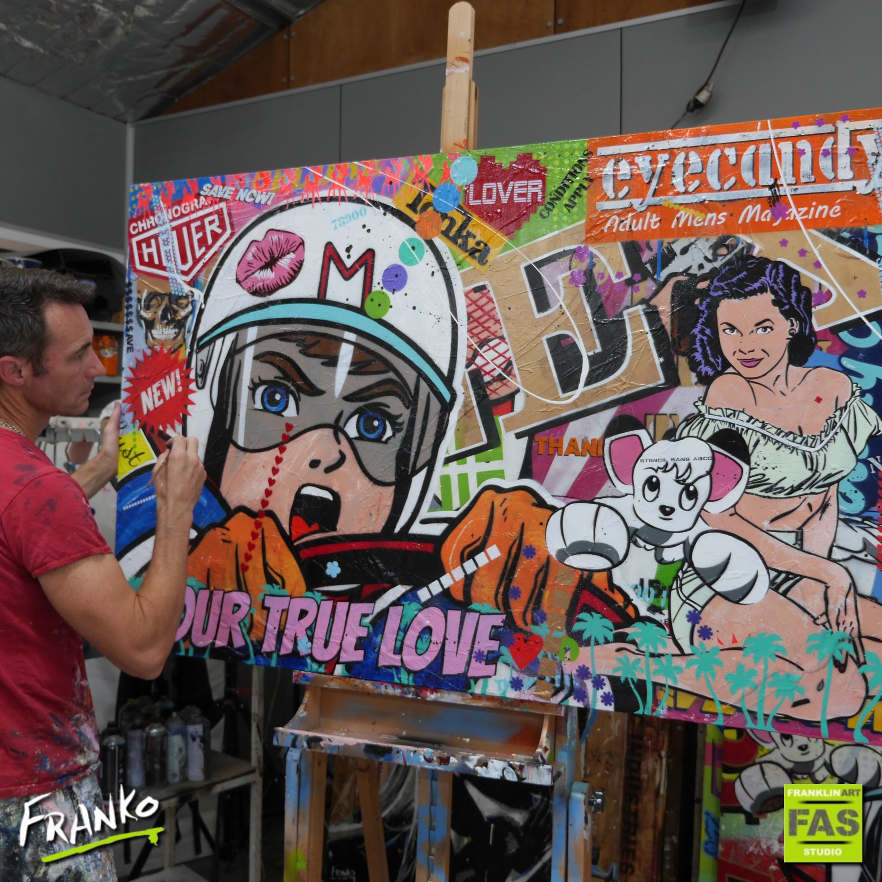 I create all of my “Urban Pop” pieces with a partial textured base, and in a grungy manner to replicate something of a wall type look. I use some forms of Brandalism once again to replicate advertising on walls. Throughout these pieces you will see disingenuous tags like “Genuine Romance” “ 1800-True Love” “Never seen before” “This will change your life” “Genuine Taste” etc etc to poke a bit of fun at the constant bombardment we all get of things that are bordering on truth and can be a bit disingenuous. I use a lot of this for balance, layering and colour within the canvas as well. Layering is an intergral part of all of my art, be it abstracts, Abstract Realism, book clubs or Urban Pop. Layers give depth.