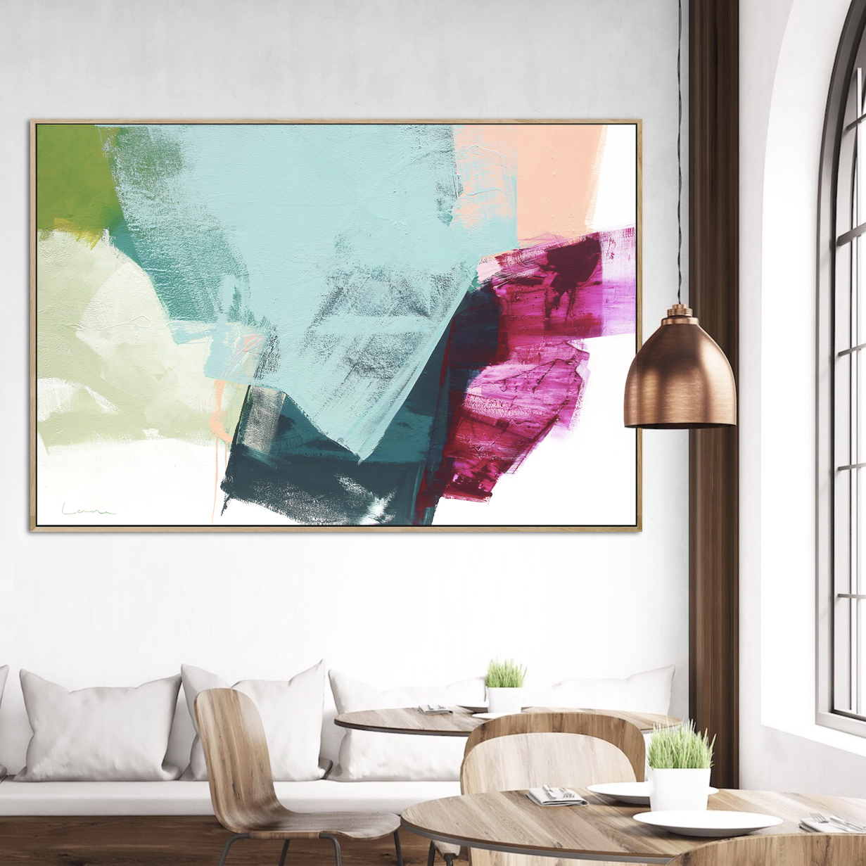 This image of Spice has been taken in the sunlight to show the beautifully textured surface but please note the texture isn’t as obvious without a direct light source. Spice is a combination of blues, greens and pink with a touch of apricot. The painting extends around the 3.8cm sides of the canvas so it’s ready to hang. An oak floating frame (as in room images) can be included for an additional $380.