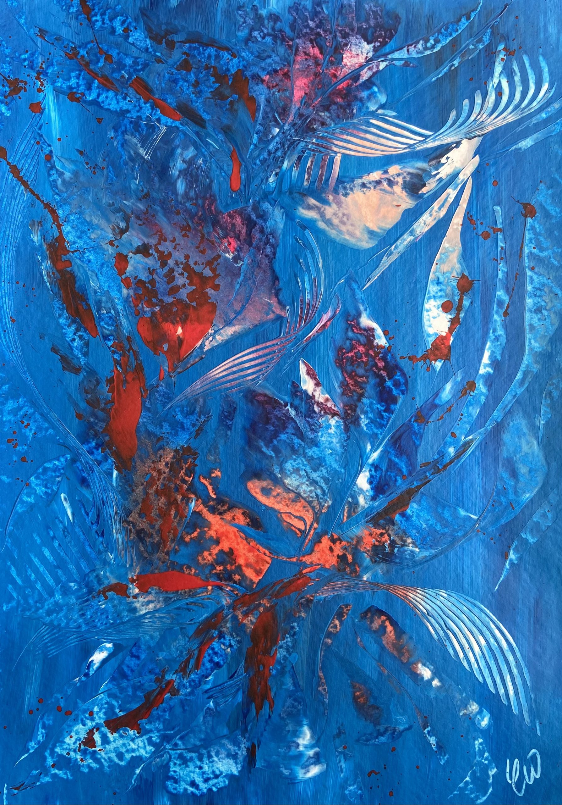 Spirited by Carrie Welsh is a lively textured abstract painting that is symbolic of energy and freedom. Some images show what this piece looks like framed. Frames not included. 59.4 x 42 cm (A2 size) Acrylic on paper. Requires framing.