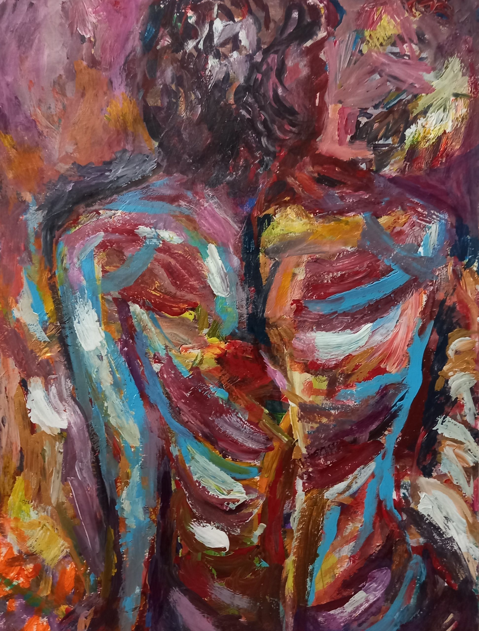 Connecting to our bodies through exercising, or meditating can be a spiritual experience. Some people see auras around people. I often intuitively see a colour in my mind when painting someone, and want this piece to celebrate a positive experience in the way we relate to our bodies. The brushstrokes in this are vibrant and energised as are the colours.