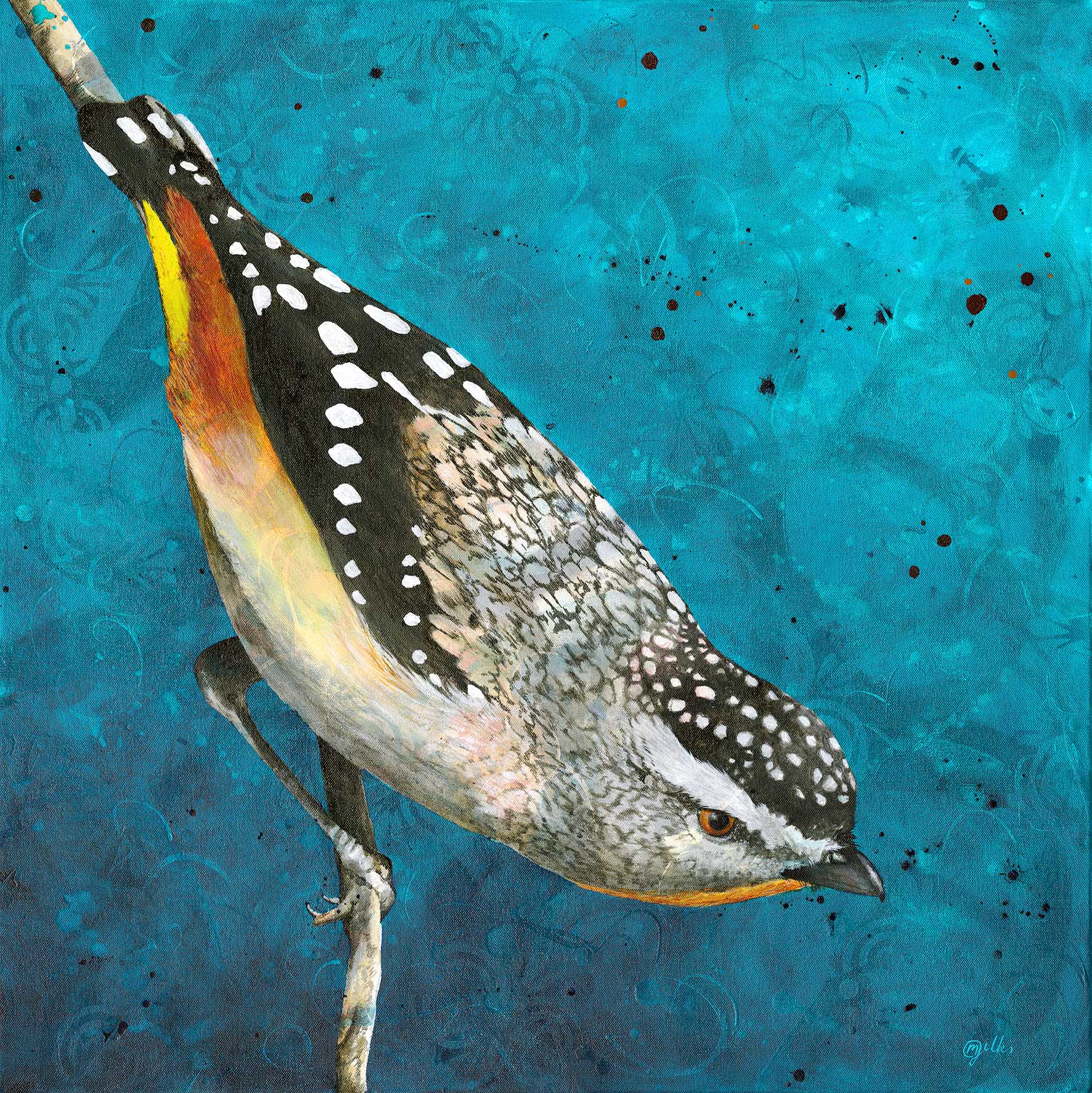 Spotted Pardalote is a limited edition print of an original acrylic painting by Michelle Gilks. The spotted pardalote is one of Australia’s tiniest birds, but arguably one of it’s prettiest. The intricate details on the feathers and distinctive white diamond-like spots on the birds back proved a painting treat for this artist!