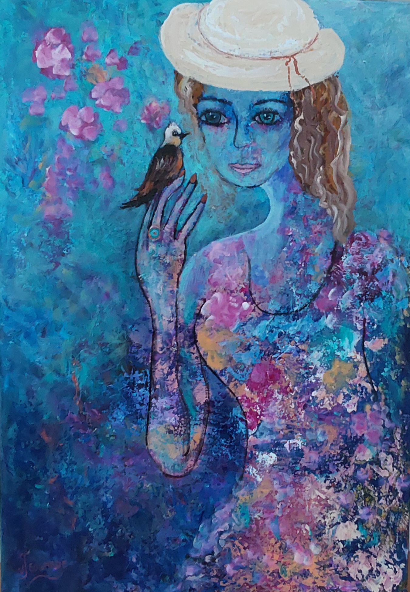 This romantic figurative has loads of texture and is very expressive, showing kindness for all creatures big and small and loving nature is featured in many of my works .