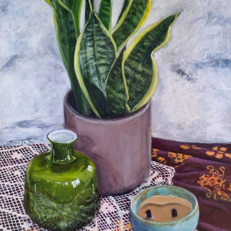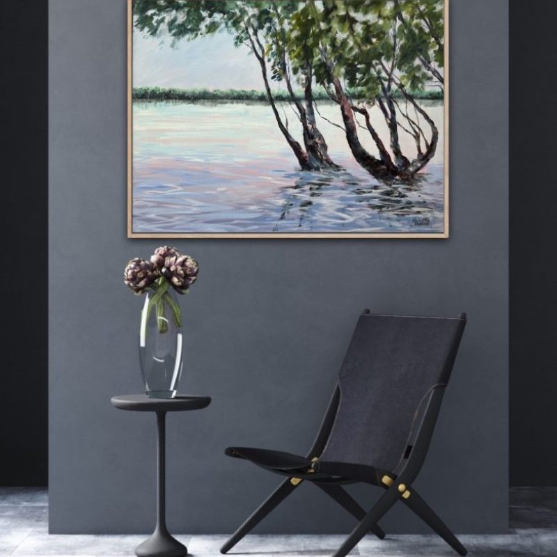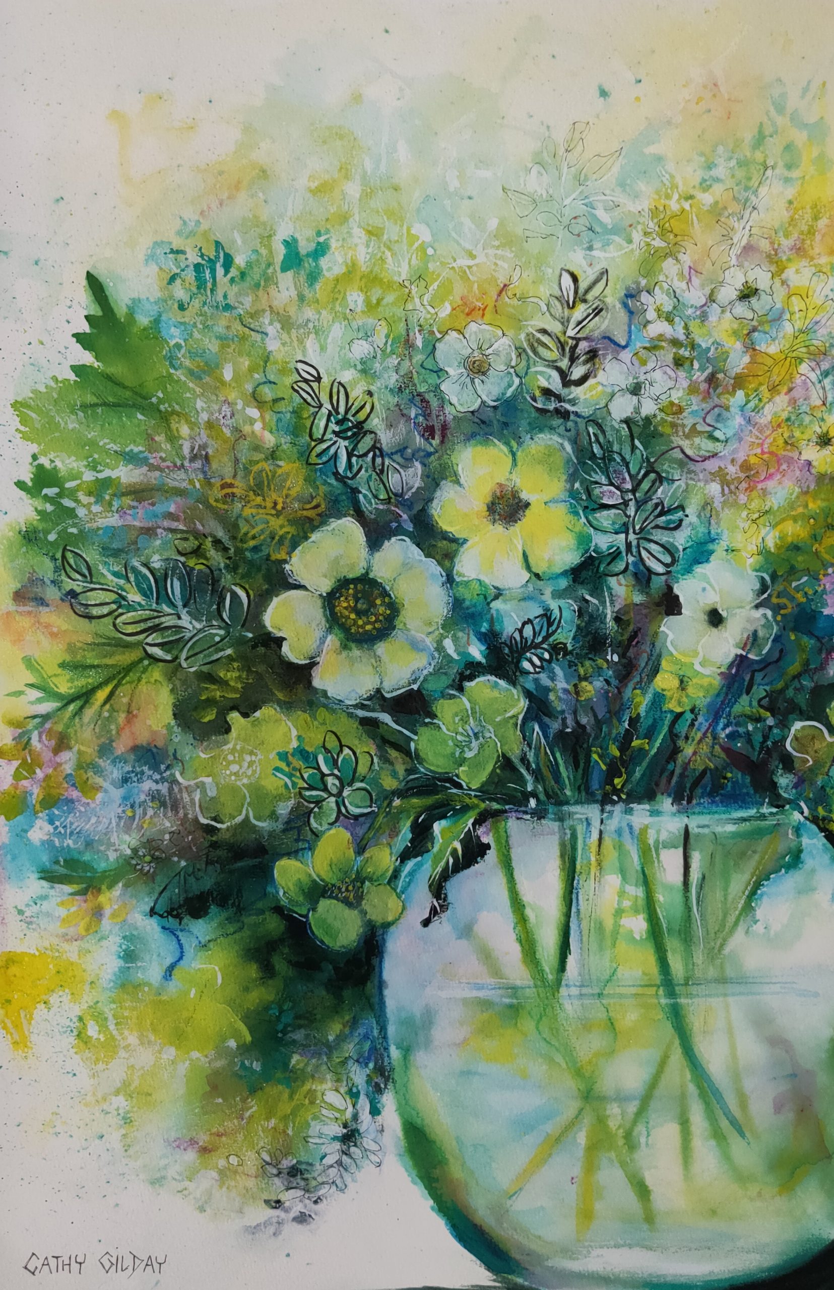 Spring Bath by Cathy Gilday – An impressionistic painting of cut flowers in a clear glass bowl. With soft lemon sunlight, bathing the floral spray, this whimsical piece expresses feeling of Springtime. Requires framing.