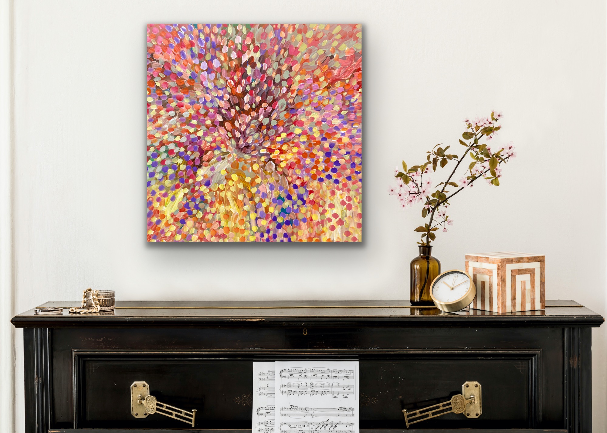 Spring Bliss Theo Papathomas –  is a painting of rich colours like a veil of petals hovering over the landscape The landscape becomes a bouquet of petals dancing over the land. I tried to create this beautiful composition of colours and rhythms of the petals swept by the winds that reminds you the colours of the rainbow. A very harmonious and tranquil composition that brings happy memories. The painting does not come with an external frame is just to get an idea. The painting is signed and dated 2021 at the back and comes with a certificate of Authenticity.