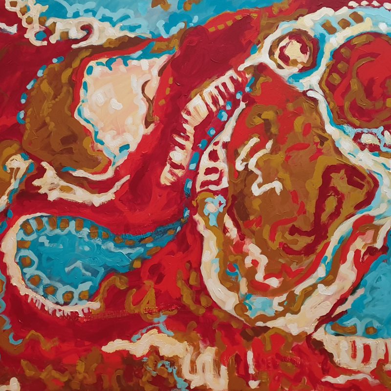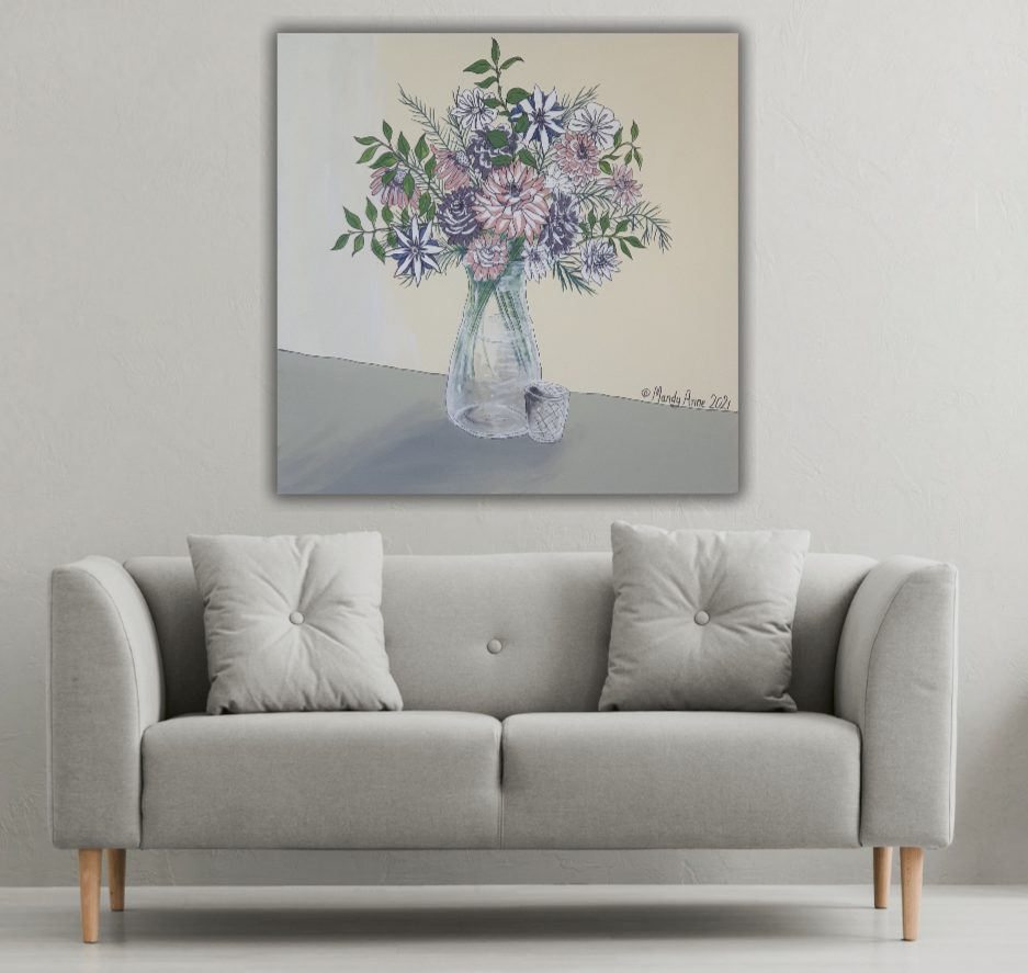 A soft and feminine floral painting using pastel tones on a 91cm x 91cm stretched canvas – sure to brighten any wall.
