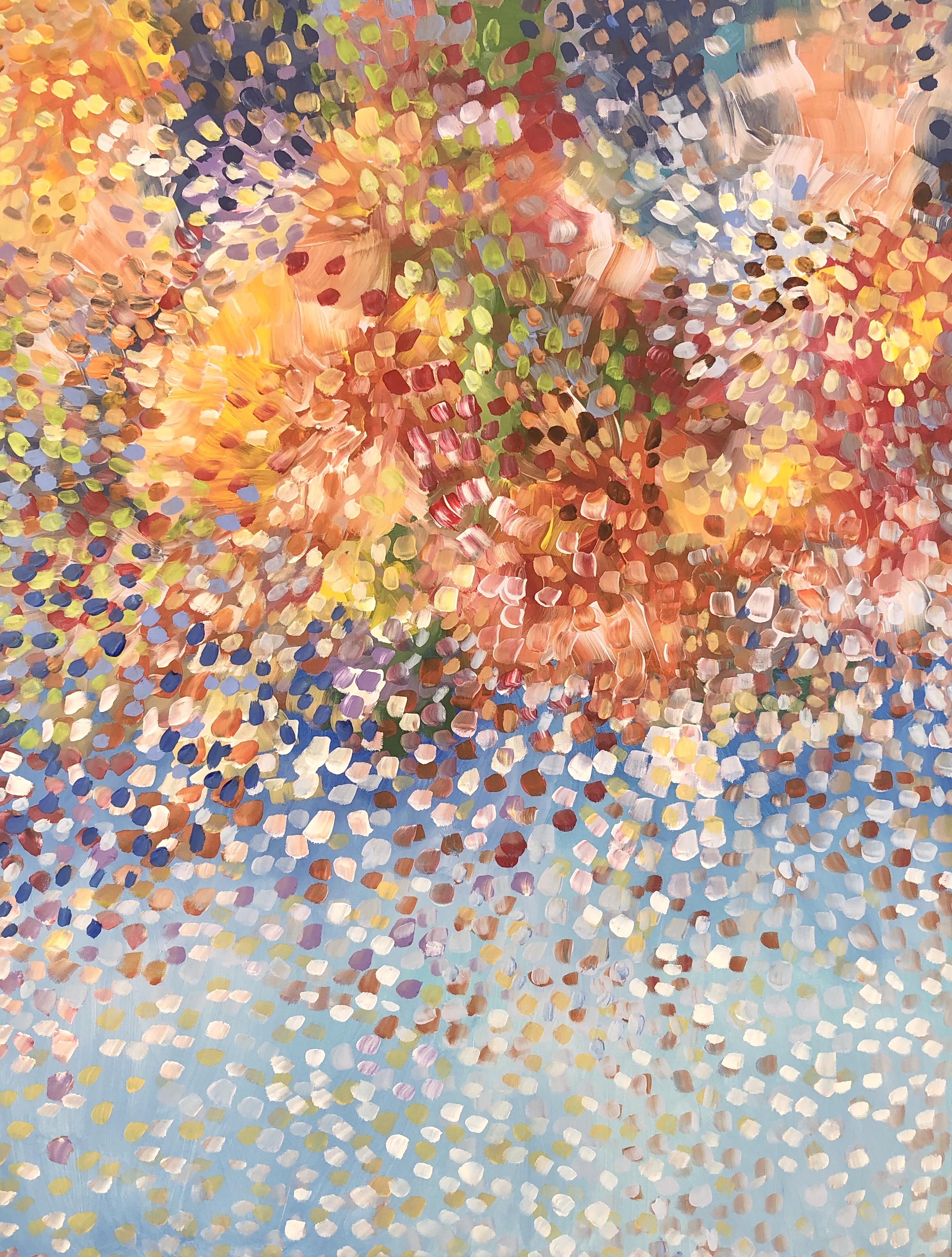 In my painting Spring Bouquet is a composition of colours and rhythms of petals dancing in the sky . An explosion of petal colours in the sky swept by the winds creating fireworks in the sky. Capturing the beautiful colours of the Rainbow petals falling onto the landscape . This painting is painted with Acrylic paints. The painting is signed and dated 2019 at the back and comes with a certificate of Authenticity.
