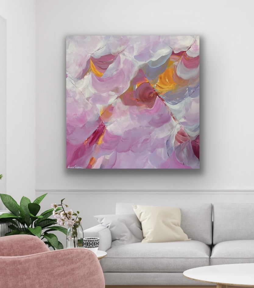 The canvas is awash with delicate shades of pink, from soft pink tones to bolder magenta hues, which blend seamlessly to create a rich, multi-layered effect.  The flowy, loose brushstrokes give the impression of movement and fluidity, as if the flowers are caught in a gentle dance. The pink colour palette adds to the overall sense of softness and delicacy, while the floral motif brings a touch of natural beauty and organic harmony to this piece.