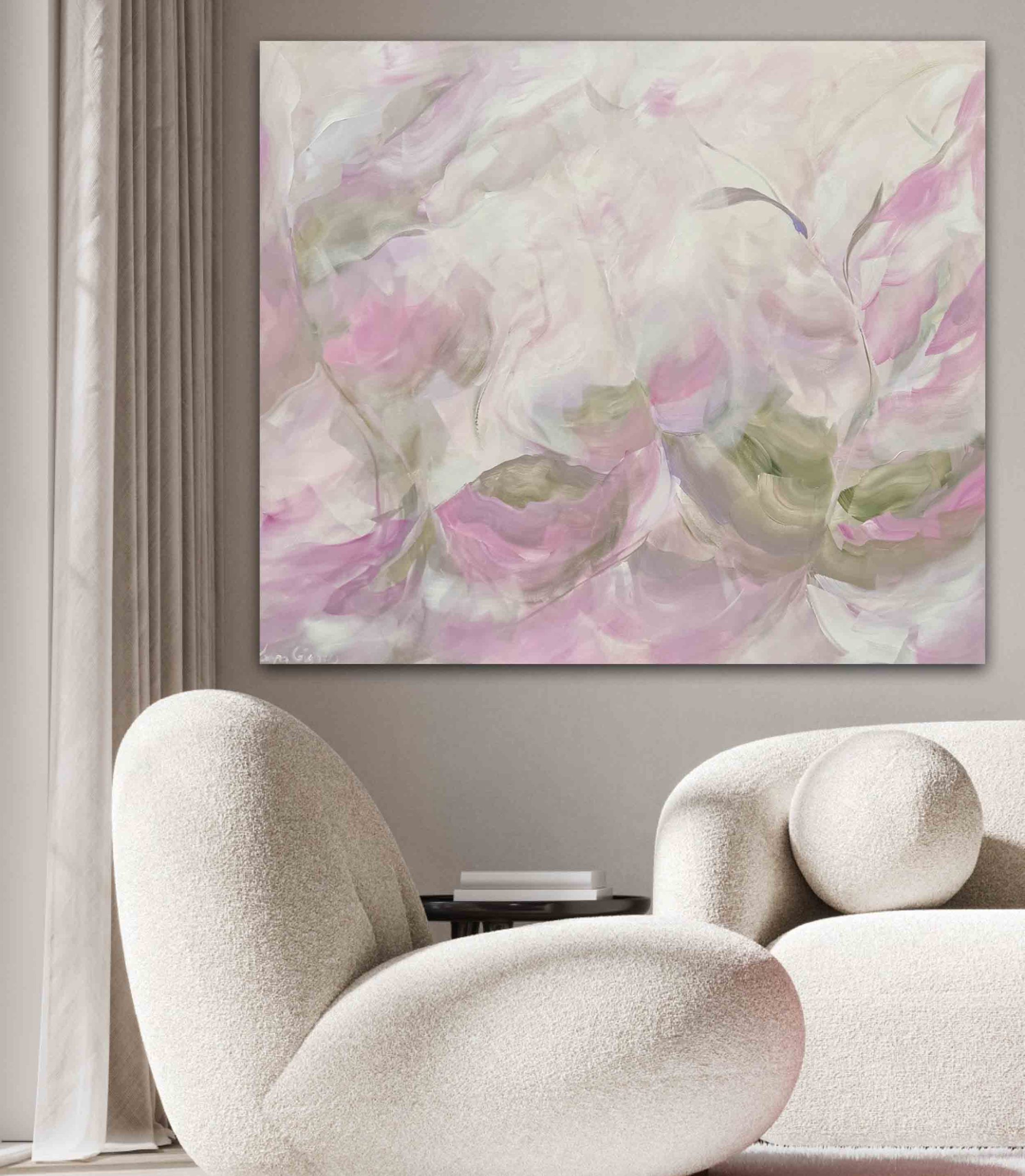 This abstract artwork features soft pink, white and green tones evoking a sense of calm and elegance. With delicate brushstrokes and a dreamlike composition, the piece adds a touch of tranquility to any space.