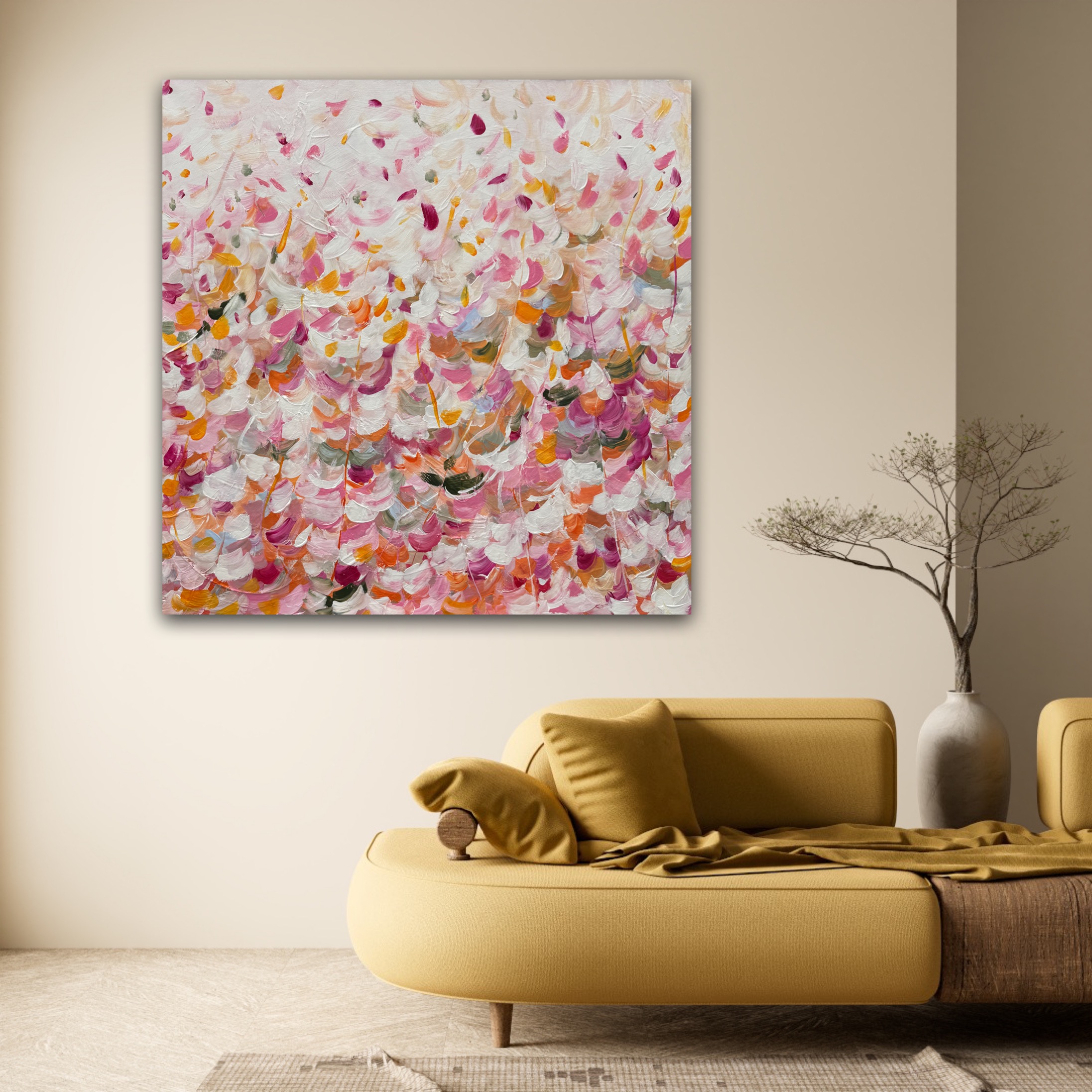Add a touch of elegance and warmth to your space with this vibrant abstract artwork. This piece captures the beauty of falling petals in a colourful display. It brings a sense of joy to any room.
