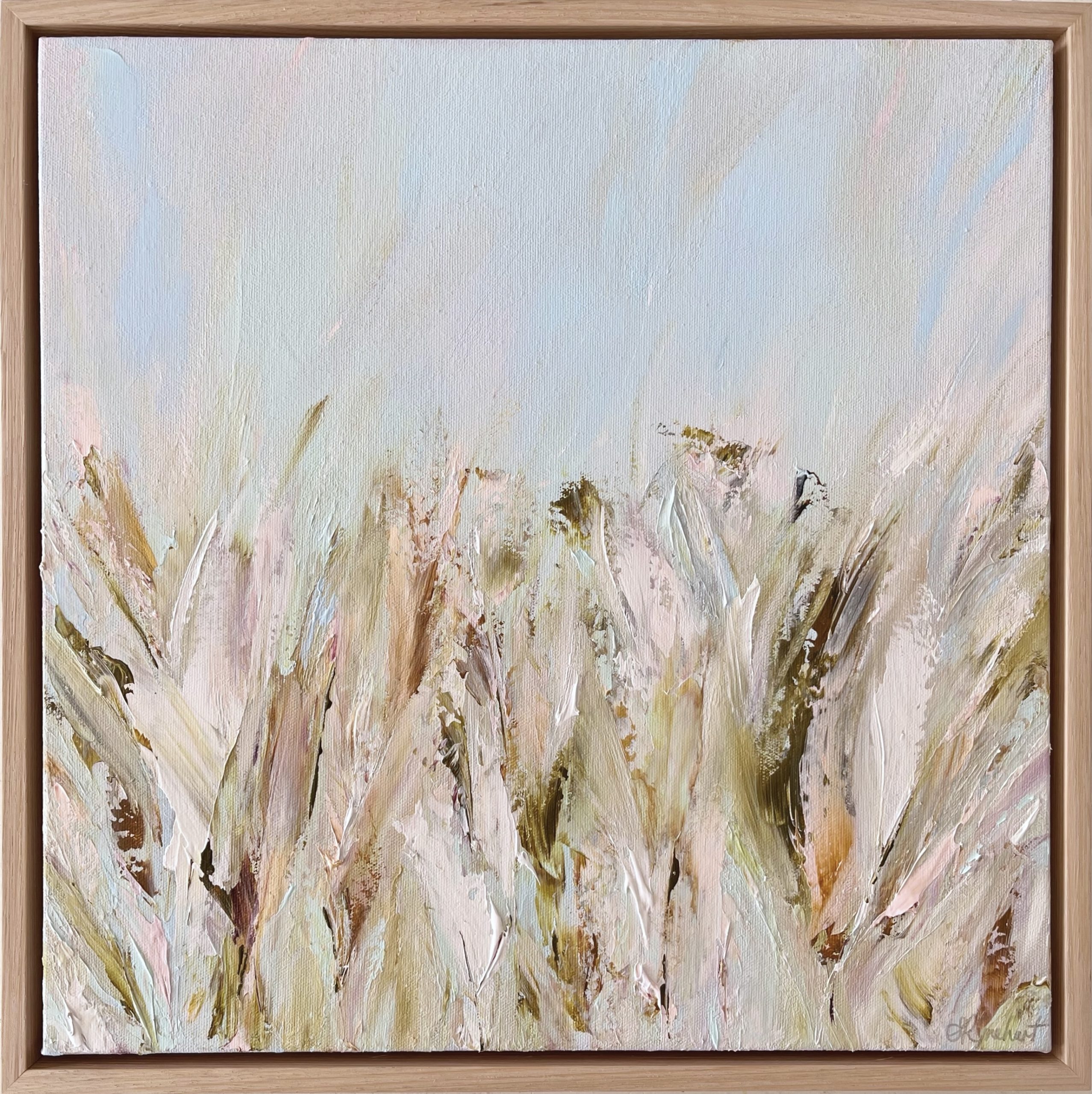 This pretty, textured abstract botanical created with palette knives is framed in a thinner profile solid oak frame – 4.5 cm, opposed to my standard 5.5 cm. It is satin varnished and comes with a COA.