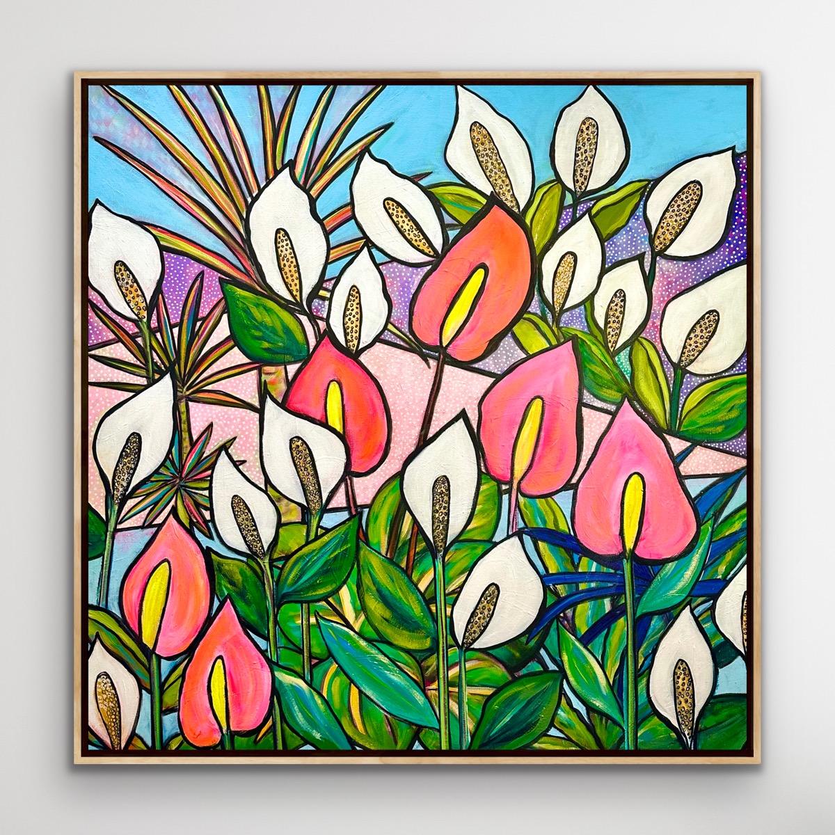 My own Springtime peace lily garden inspired this contemporary, interpretative painting into life.
