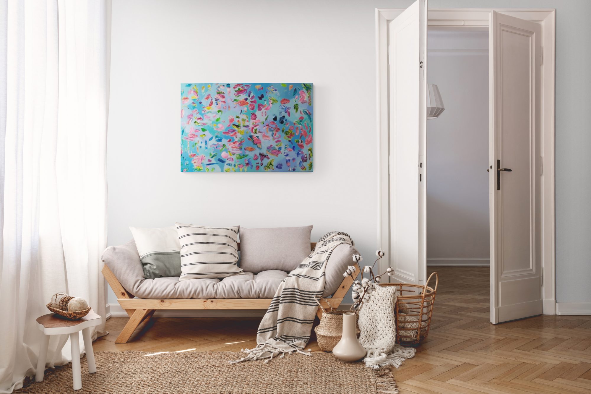 I love fresh bright colours of spring! This piece of artwork is done in many layers. Â The edges are painted blue to match the background, it’s ready to be displayed.