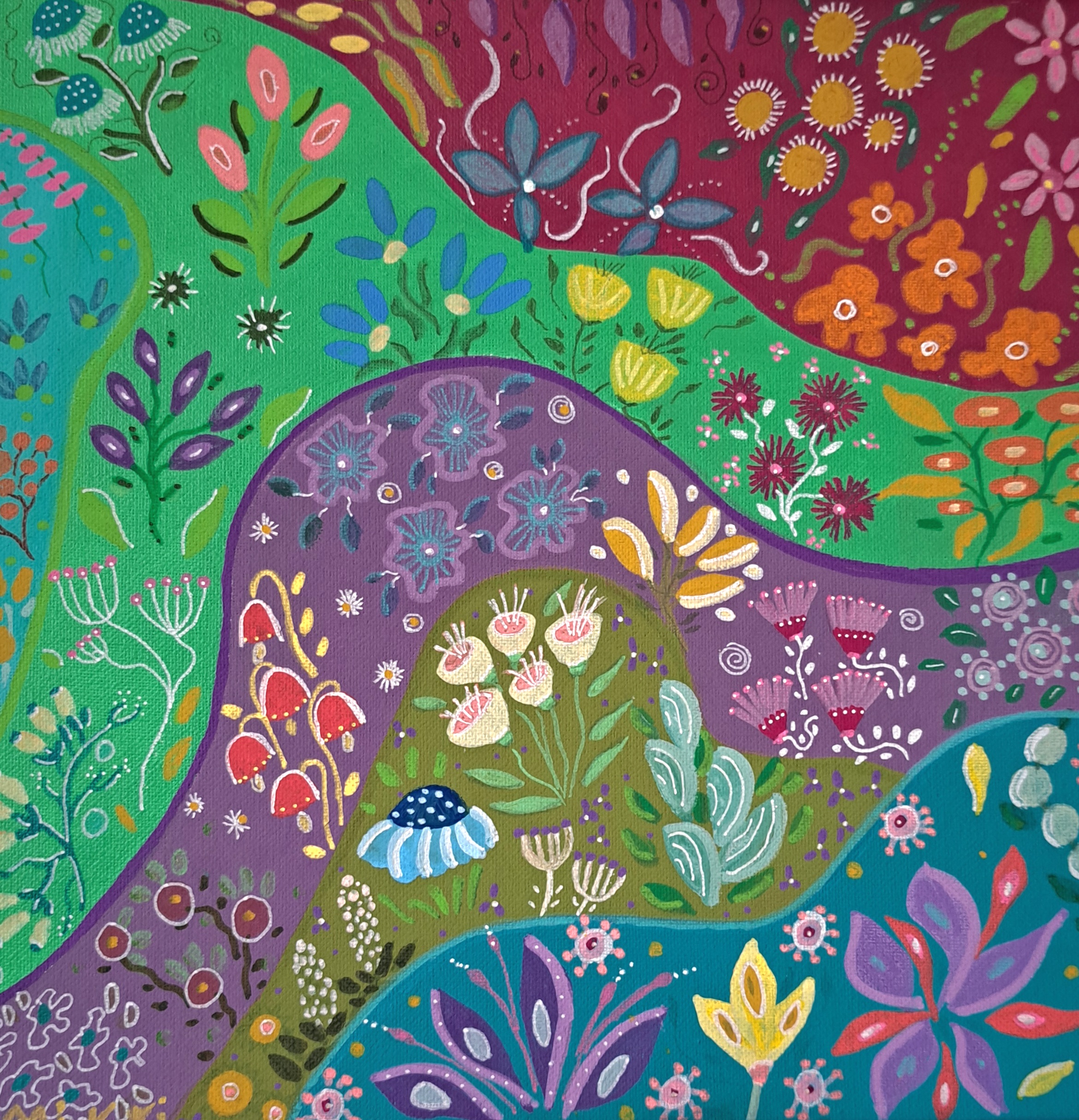 This is another of my wave paintings, something I started to do this past year. It didn’t start out that way but most of my artworks are like that. I painted this just before Christmas while getting over Influenza A and wasn’t in a particularly creative mood. But painting changes that for me and colour is where I get my joy!