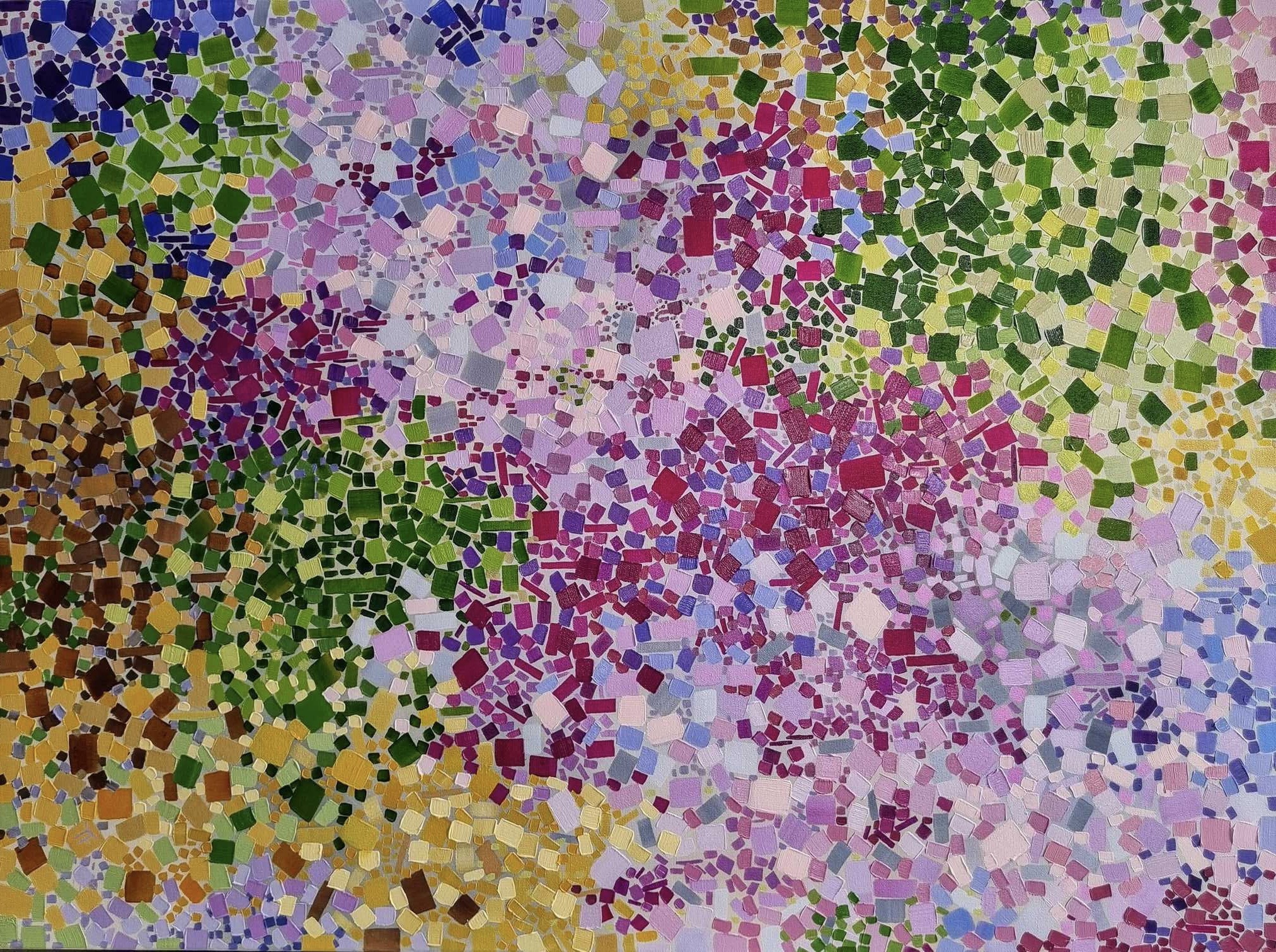 Frankly, this is one of my favourite paintings. I just love the colours, how they dance around the canvas, and the energy this combination exudes. Every “patch” or “square” has its place. They are applied with various brushes, and the level of texture varies—some are very thick, some are light and transparent. The combination creates this beautiful “movement” effect. This painting is like a song.