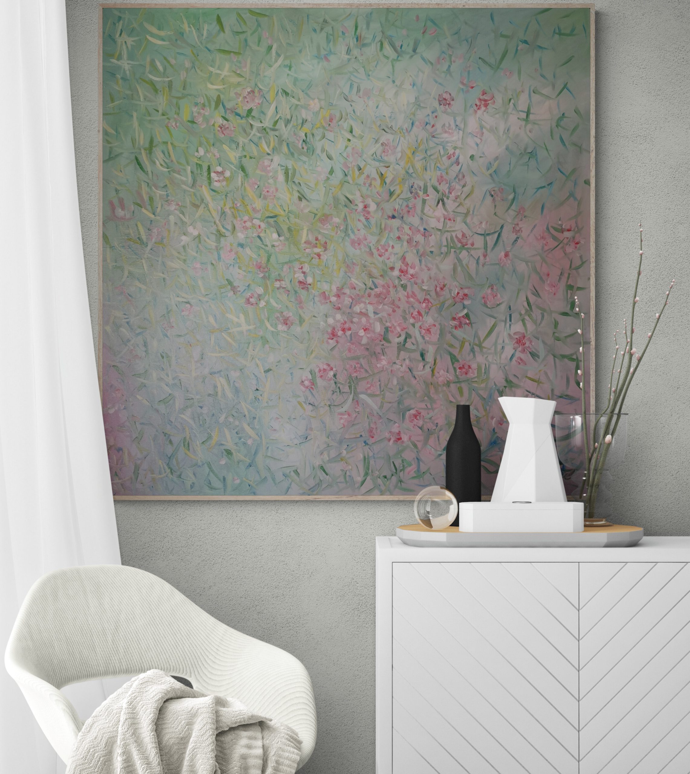 Spring Time by Fang Cai – 92X92 Large Oak Framed landscape. Most of our rooms are white, or other single color, try to let this work to bring the color of spring into your home, make people happy, full of hope and vitality of the light green, let people feel the future is possible, gentle pink to soothe your heart!